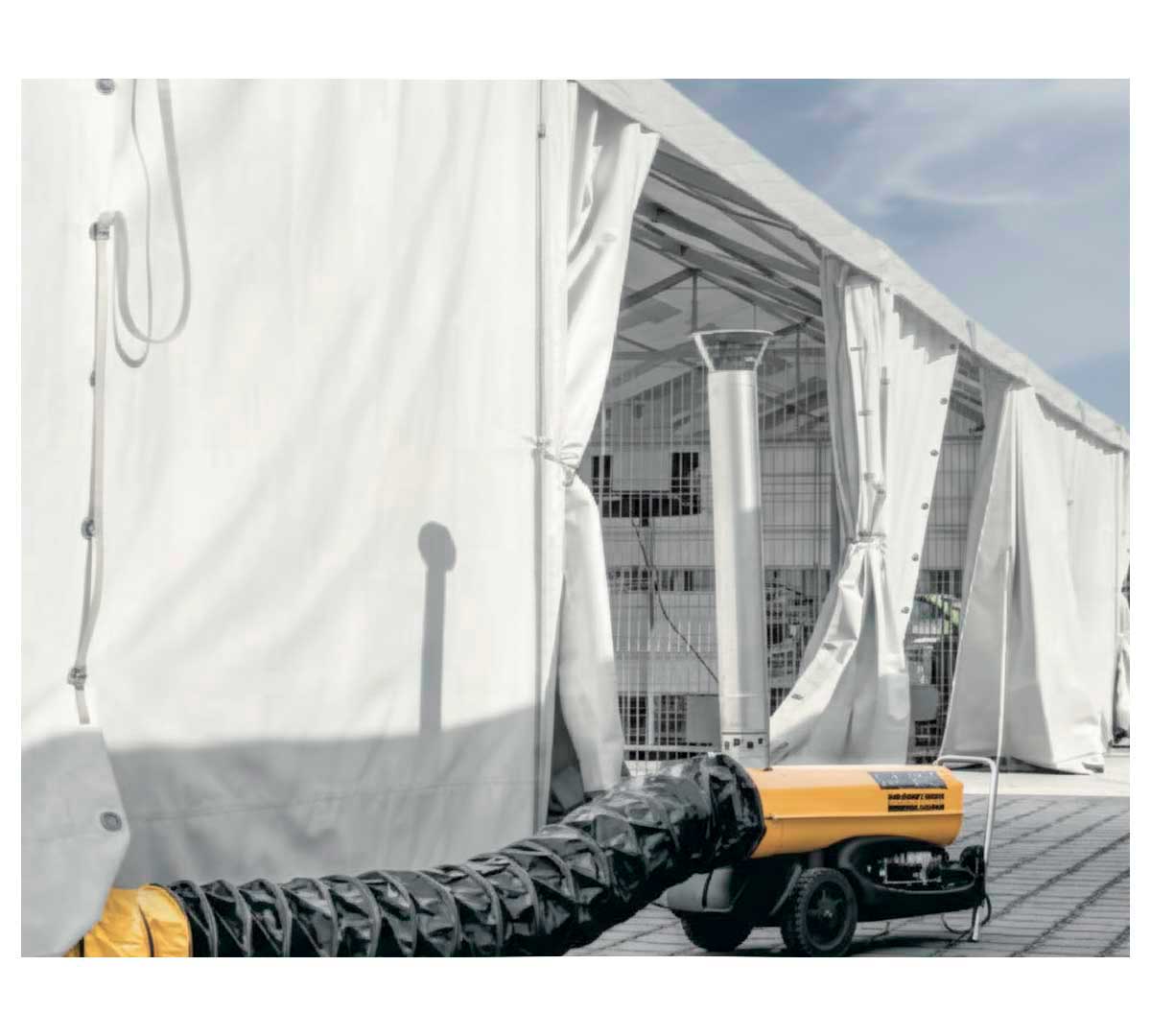 Este generador de aire caliente es perfecto para calentar rápidamente naves industriales, almacenes, carpas, talleres, espacios de construcción y cualquier área de gran volumen que requiera una distribución homogénea del calor sin contaminación por humos.