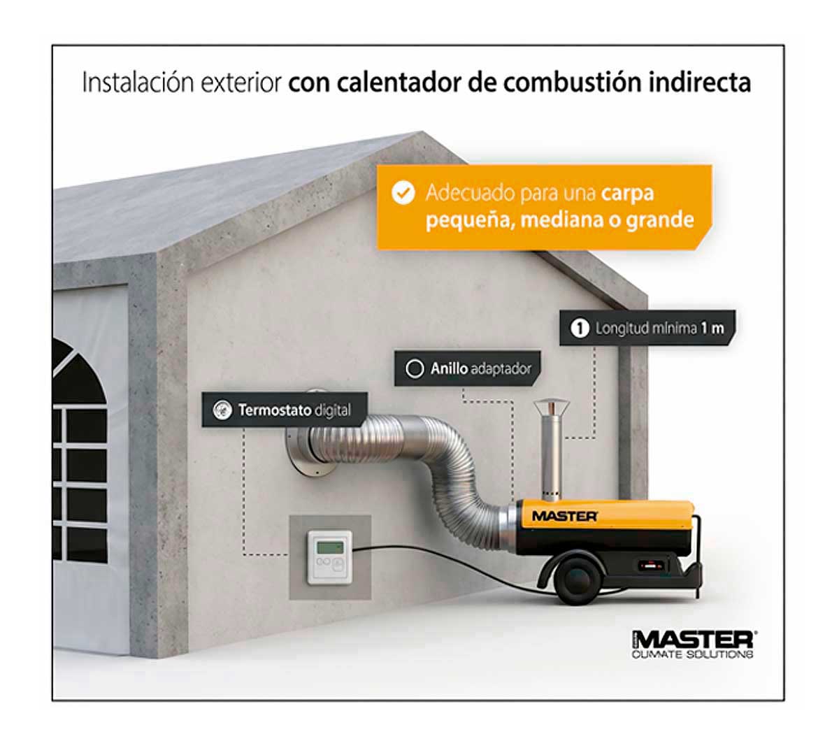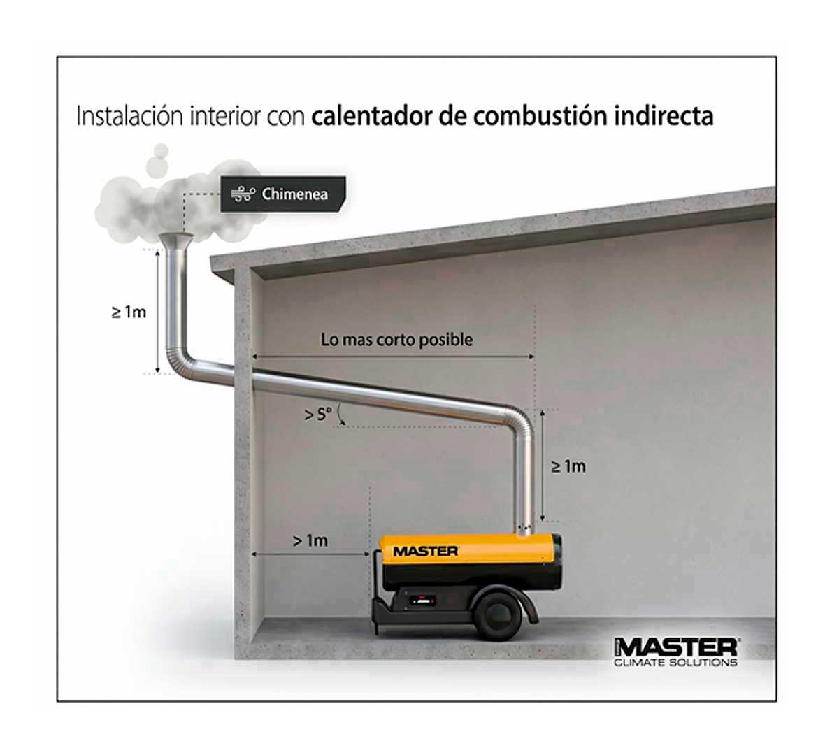 Este modelo dispone de una salida redonda diseñada para conectar tubos flexibles, lo que facilita la distribución del aire caliente en espacios específicos como obras o estancias cerradas.