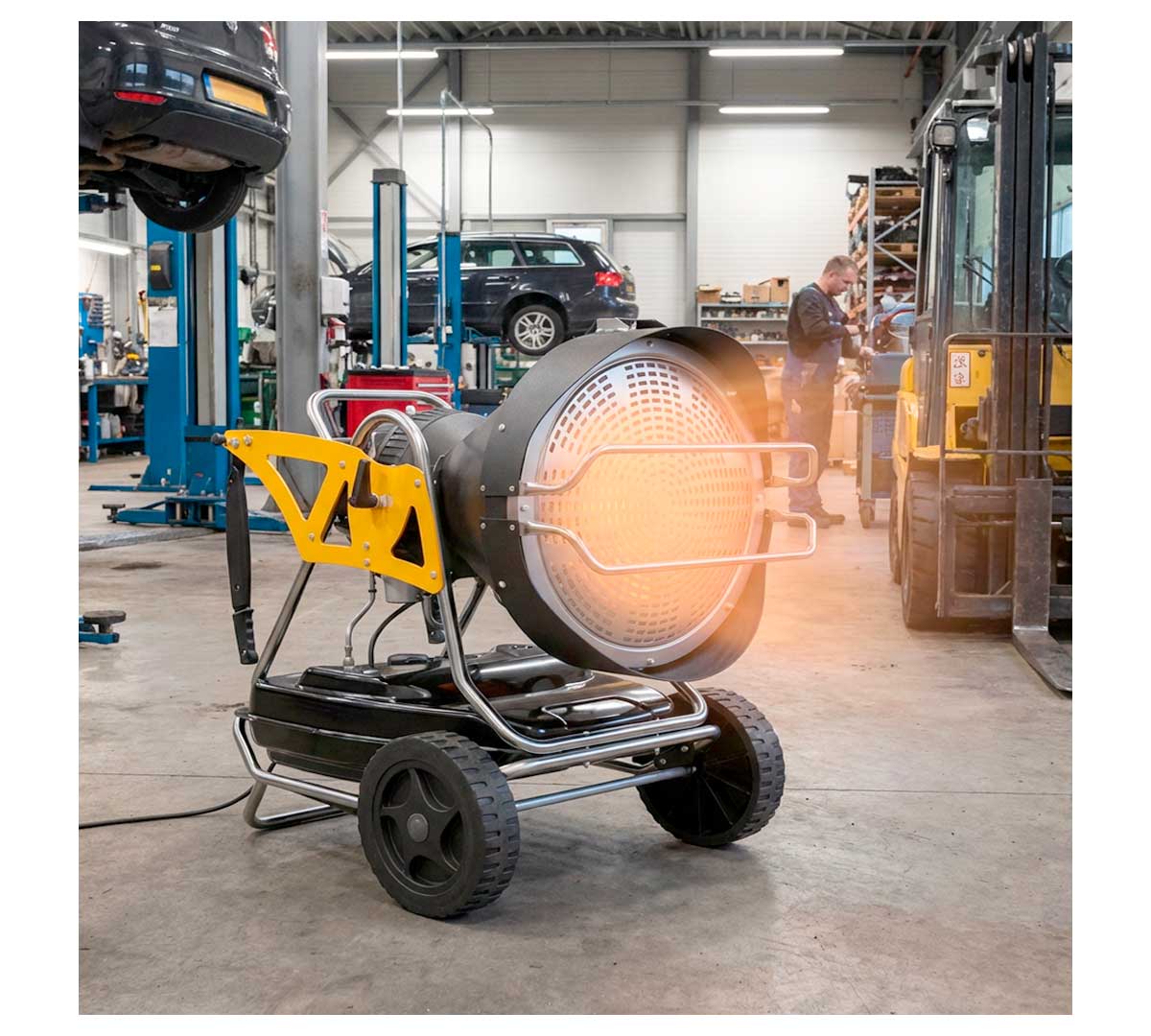 Este generador de calor radiante es idóneo para calentar, descongelar y secar en espacios bien ventilados, como almacenes, talleres, obras y zonas industriales donde se requiera una fuente de calor móvil y potente. Gracias a su autonomía y a la posibilidad de conexión a termostato ambiente, permite un control automático y eficiente de la temperatura.
