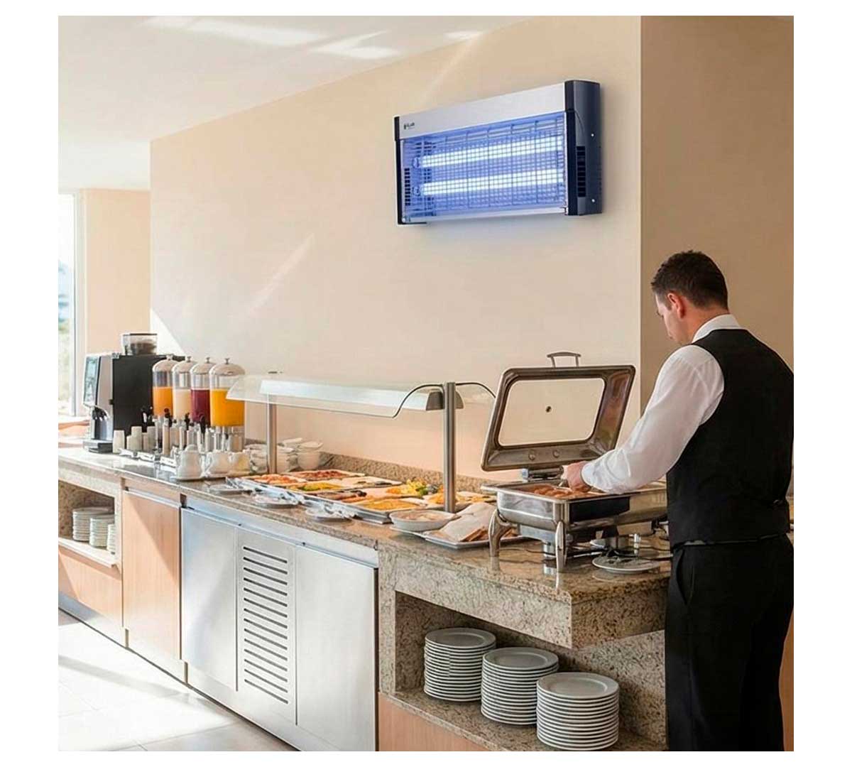 Insectocutor de parrilla eléctrica fabricado en acero inoxidable. Tiene 2 tubos con una potencia de 20 W cada uno. Puede instalarse apoyado en una superficie o en el techo. La cadena está incluida. Para uso en interiores.