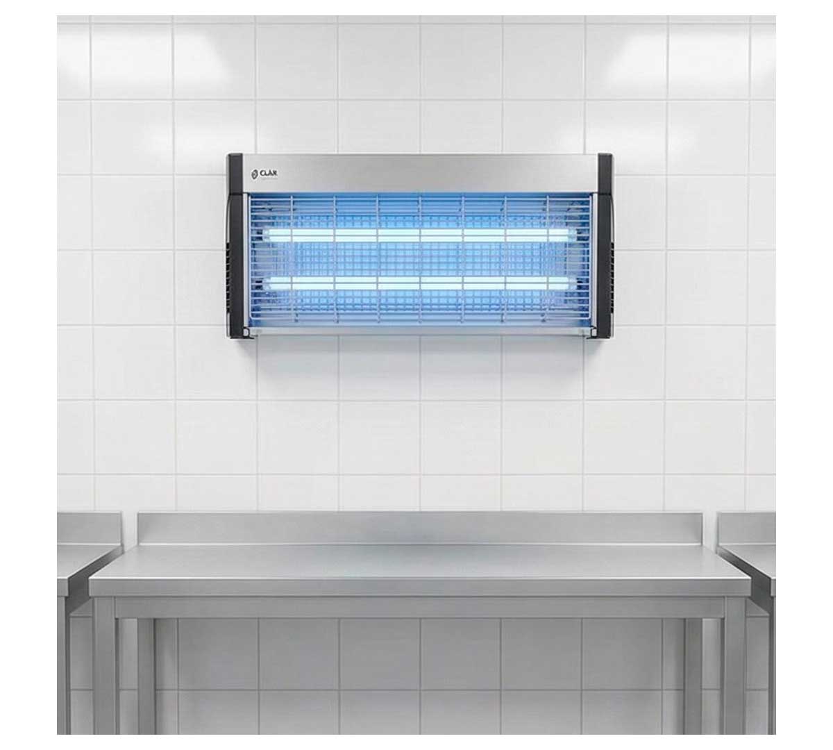 Insectocutor de parrilla eléctrica fabricado en acero inoxidable. Tiene 2 tubos led con una potencia de 40 W cada uno. Puede instalarse apoyado en una superficie o en el techo. La cadena está incluida. Para uso en interiores.
