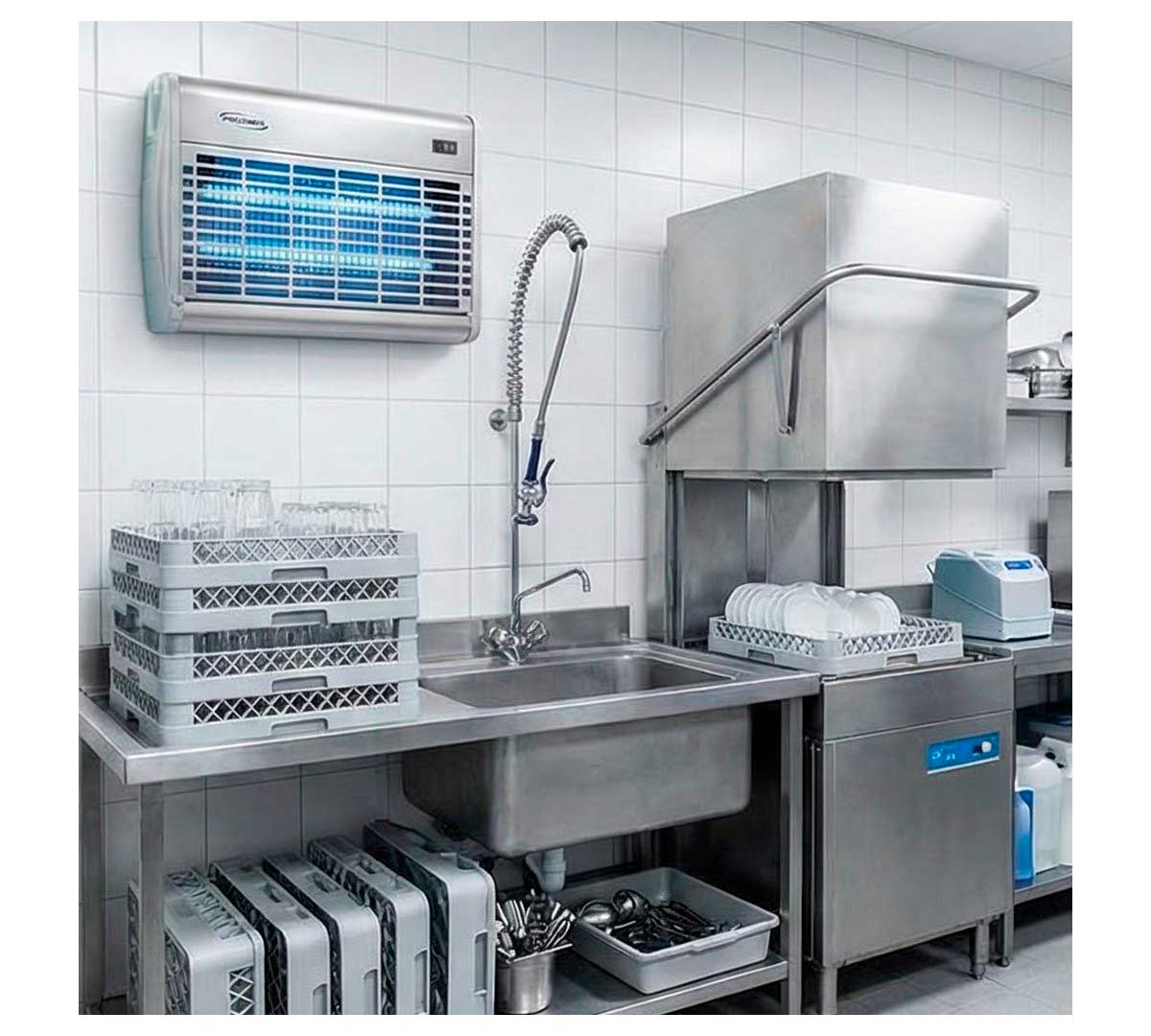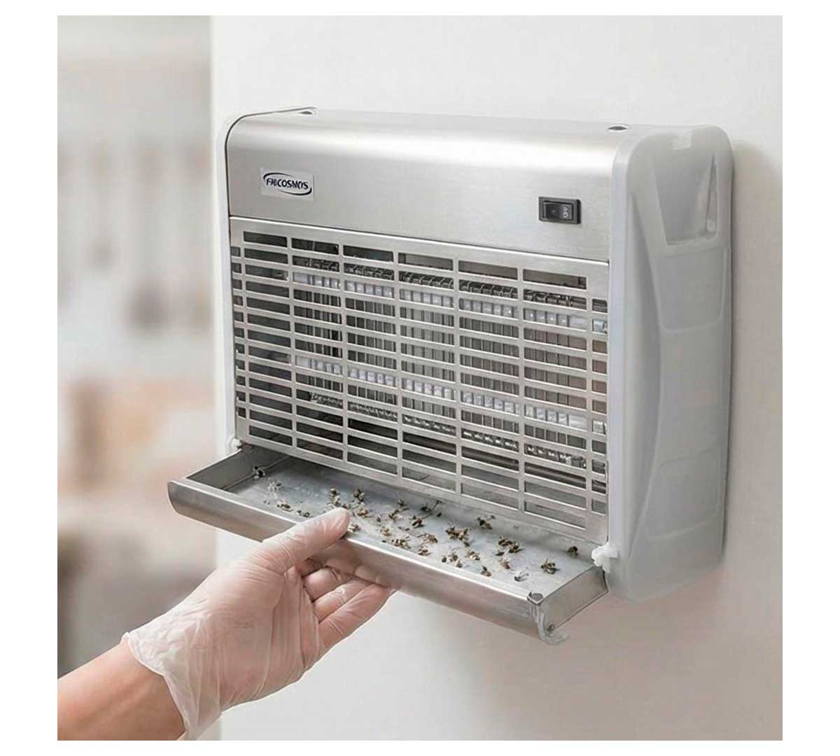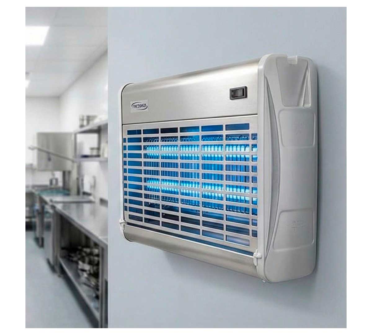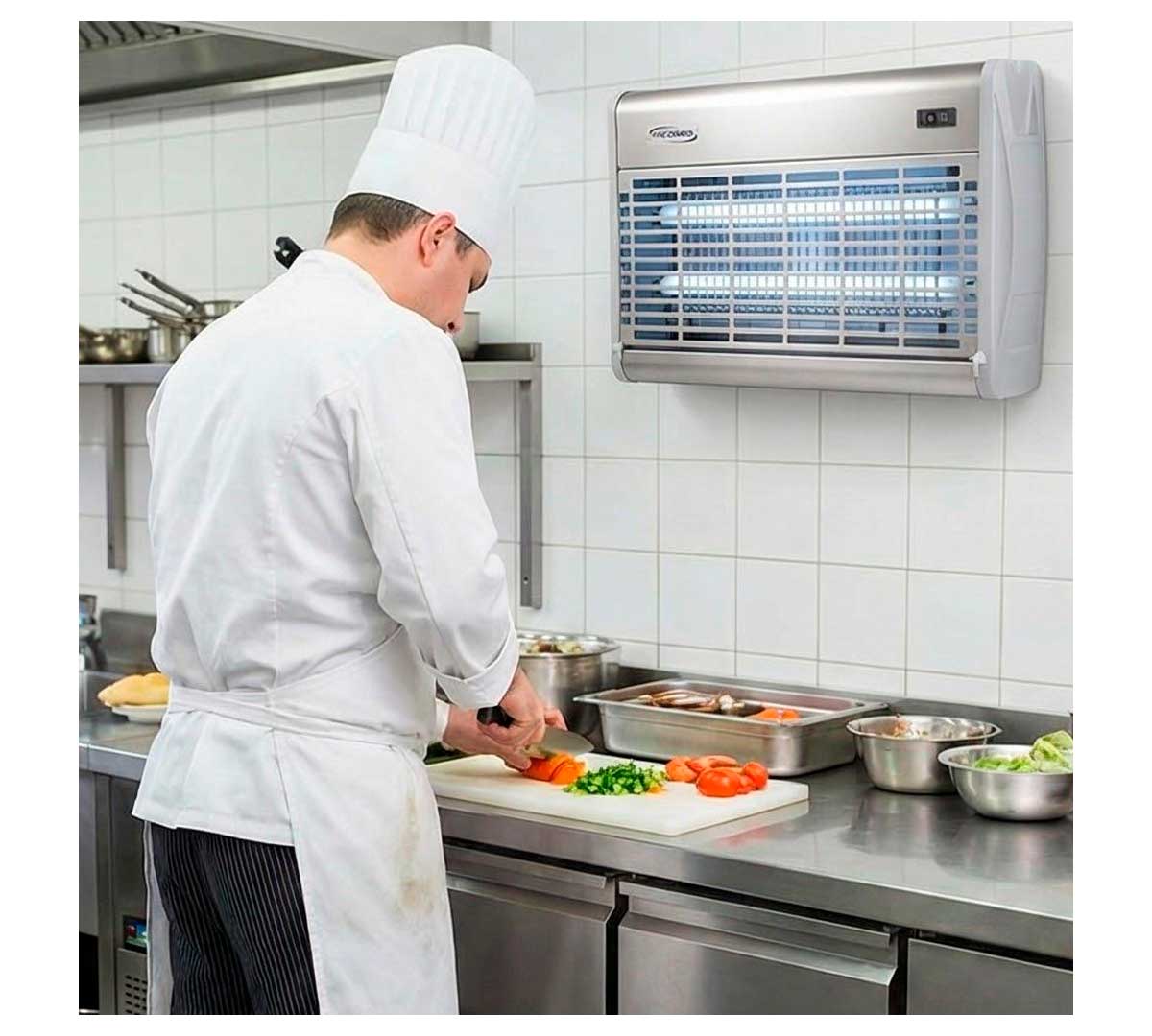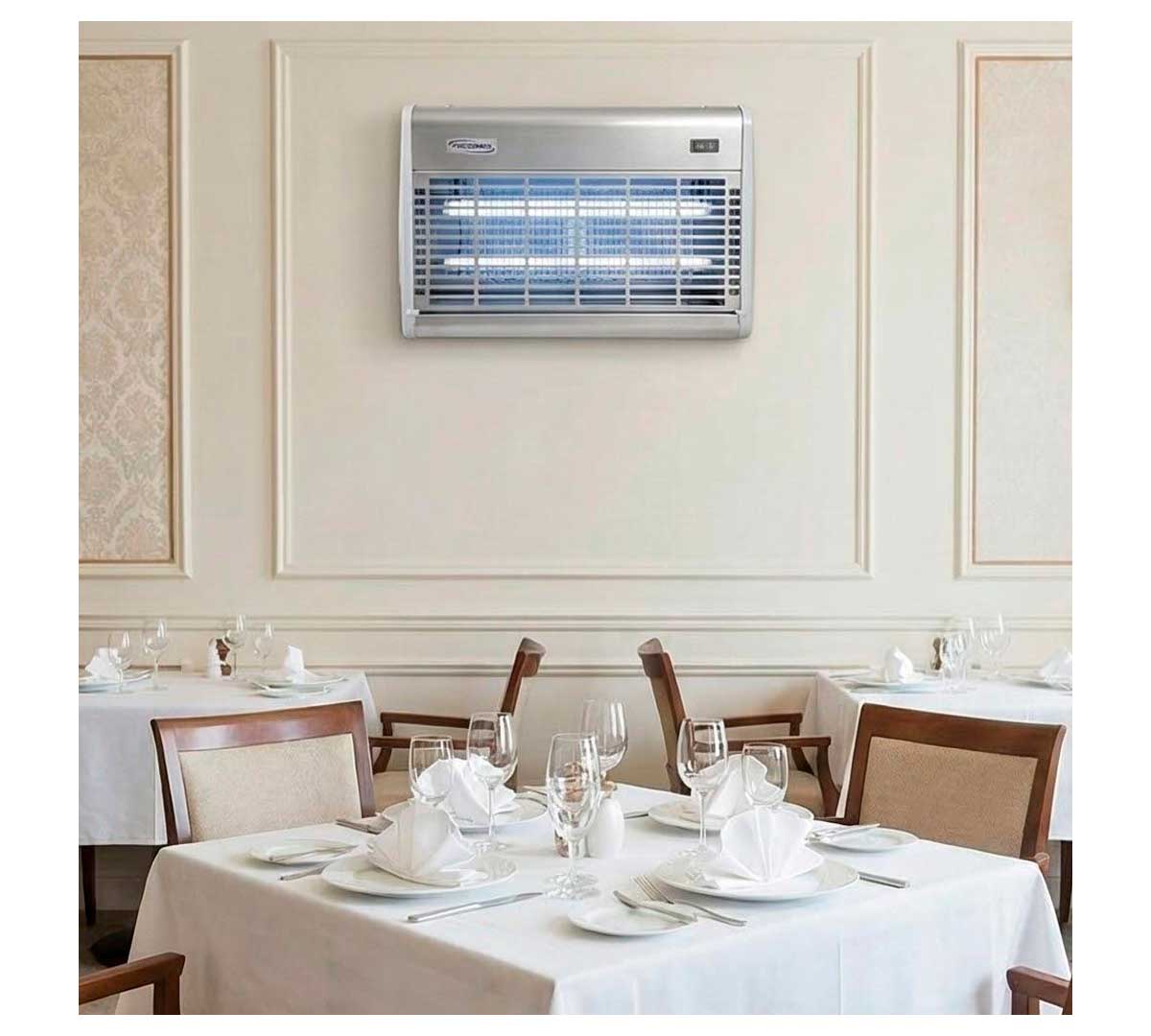Insectocutor de parrilla eléctrica fabricado en acero inoxidable. Dispone de un sistema de apagado automático al extraer la bandeja. Con 1 bombilla led para disminuir el consumo eléctrico.