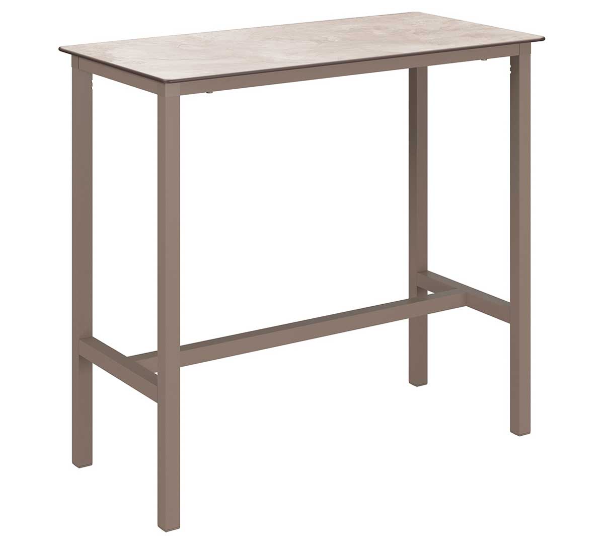 Mesa alta rectangular apta para su uso en interiores y exteriores. La estructura es de aluminio lacado en color taupe. El tablero es compacto de alta densidad. Los colores del tablero antracita y mármol negro se recomiendan utilizarlos en zonas con sombra. Es compatible con el taburete Attic de Ezpeleta.