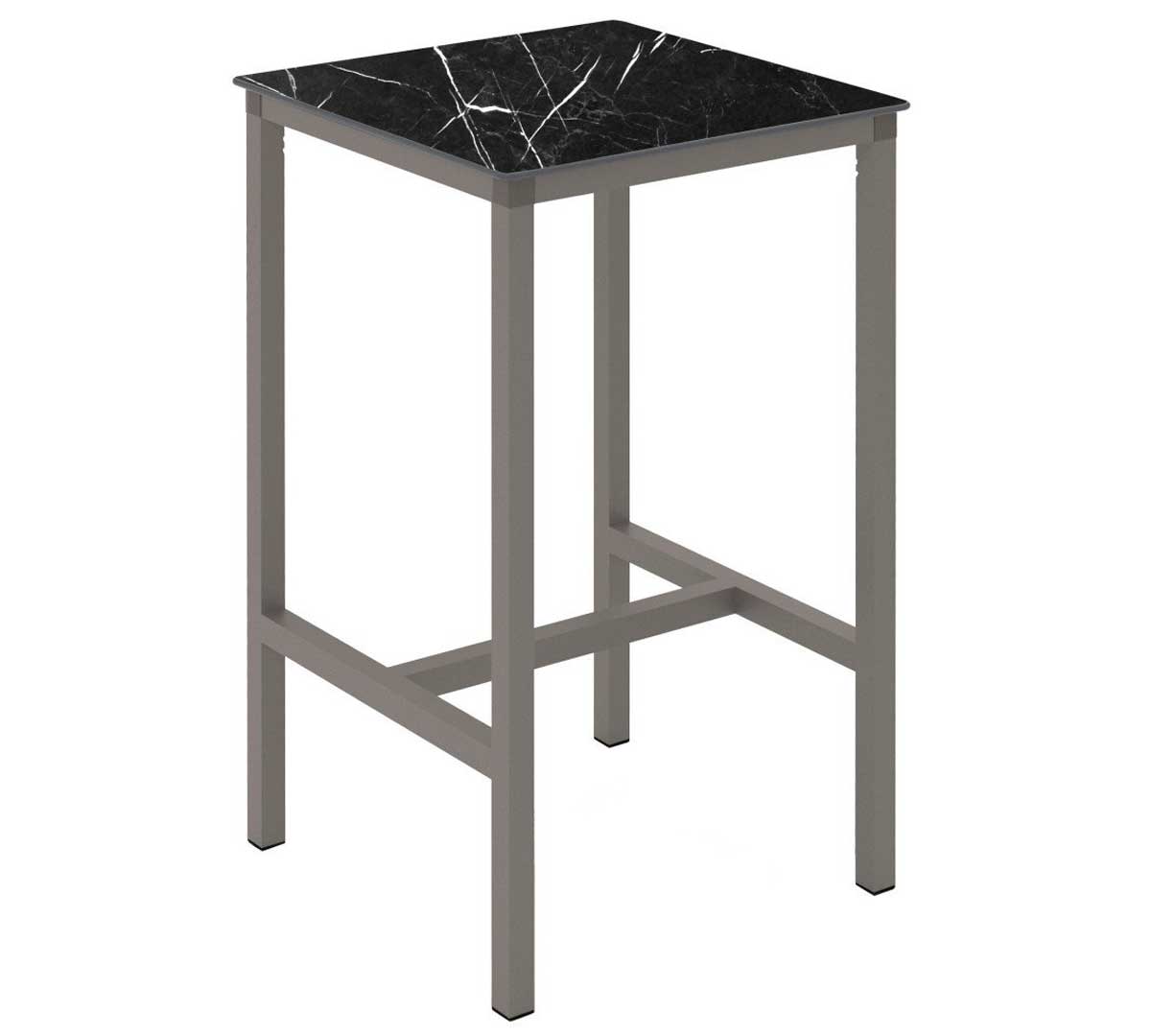 Mesa alta de diseño cuadrado apta para interiores y exteriores. La estructura es de aluminio lacado color taupé. El tablero es de compacto. Sus dimensiones son 70 x 70 x 110 cm. Los colores del tablero antracita y mármol negro se recomiendan utilizarlos en zonas con sombra. Es compatible con el taburete Attic de Ezpeleta.