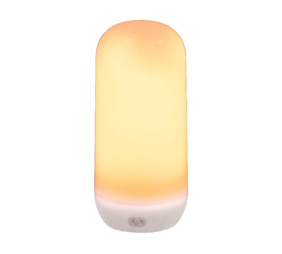 Lámpara LED recargable de polietileno, resistente e irrompible. Con efecto llama y luz cálida regulable. Uso interior y exterior. Autonomía de hasta 20 horas y carga por USB tipo C.