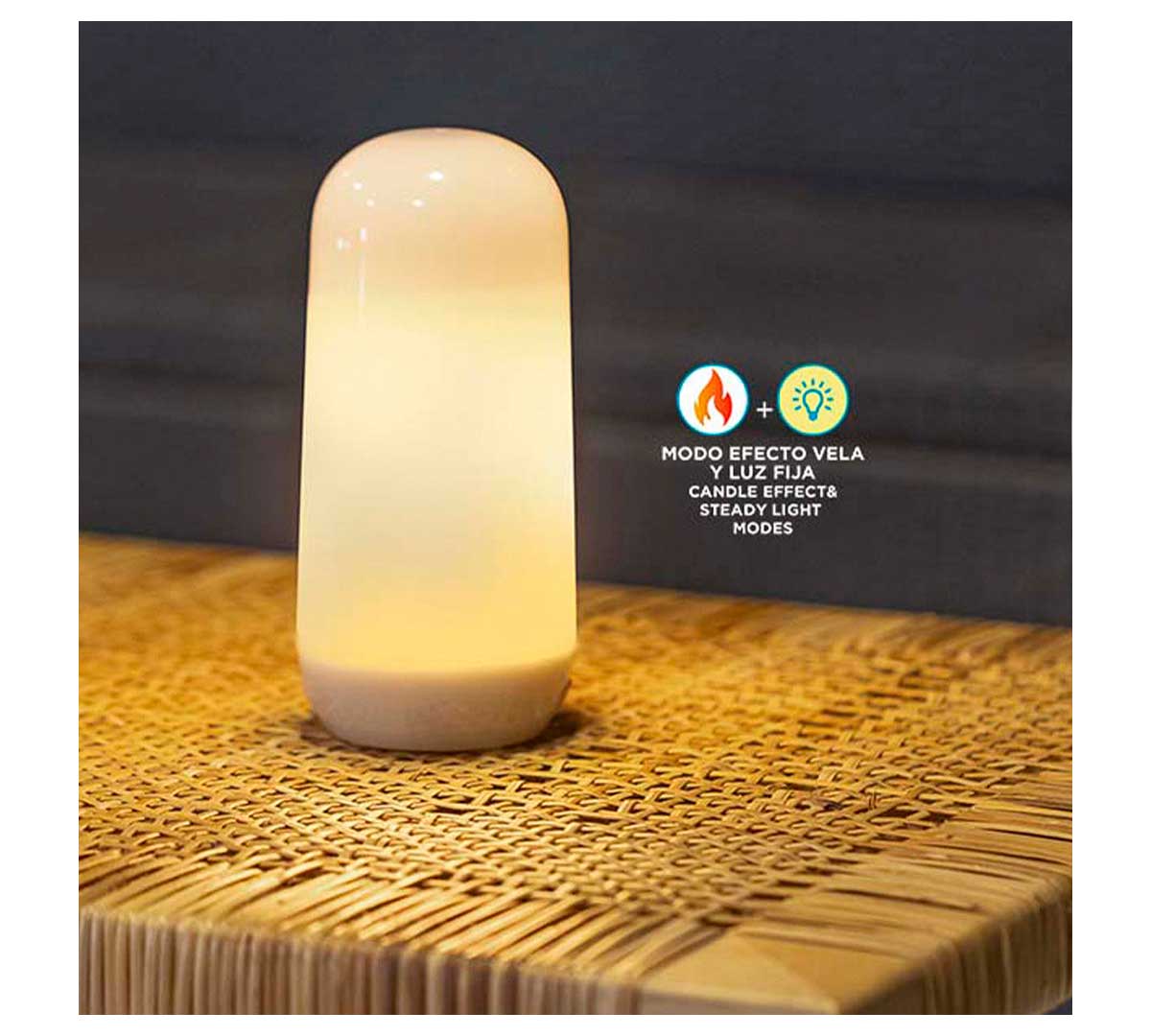La Bombilla Recargable Candy dispone de tres modos: apagado, luz fija cálida y efecto llama, que simula la llama real para ambientación. Se controlan vía mando a distancia por infrarrojos facilitando su uso en interior y exterior.