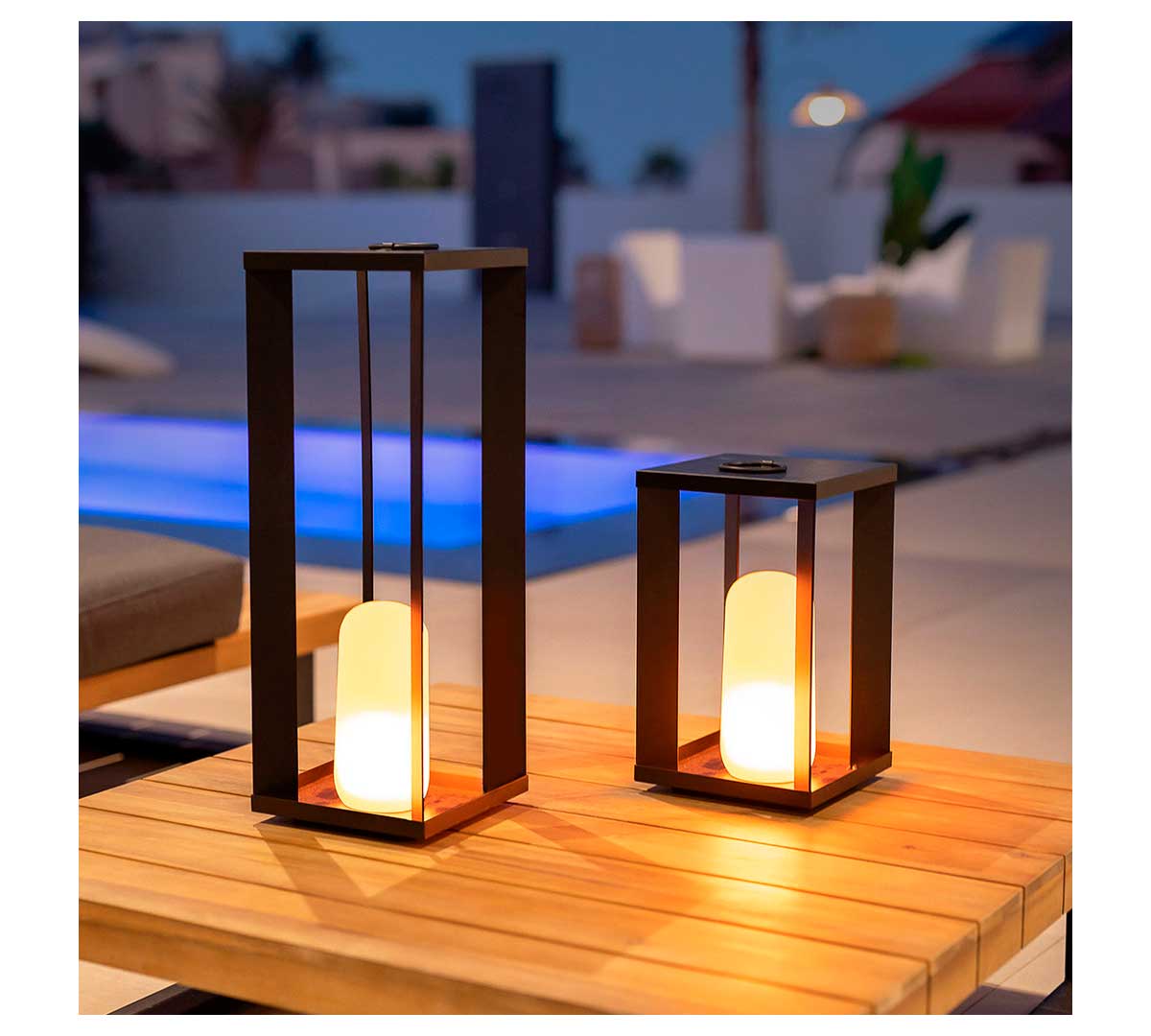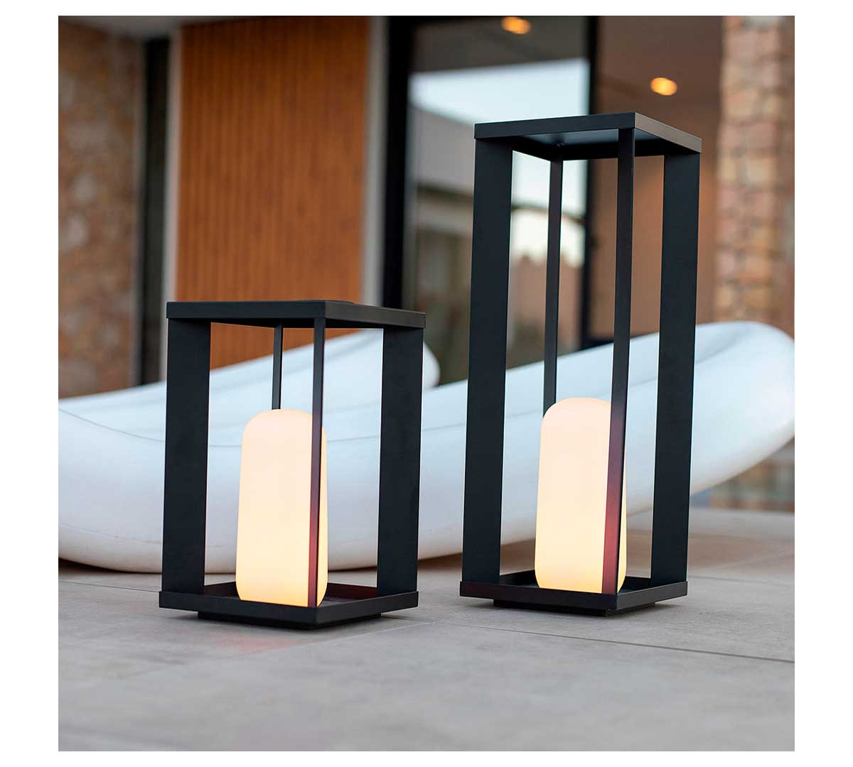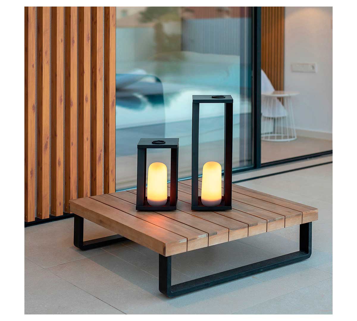 La Siroco pertenece a la serie decorativa de New Garden y se presenta en dos modelos, 30 y 50 cm de altura, ambos con batería recargable, iluminación LED regulable y diseño tipo farol pensado para uso profesional en interior y exterior.