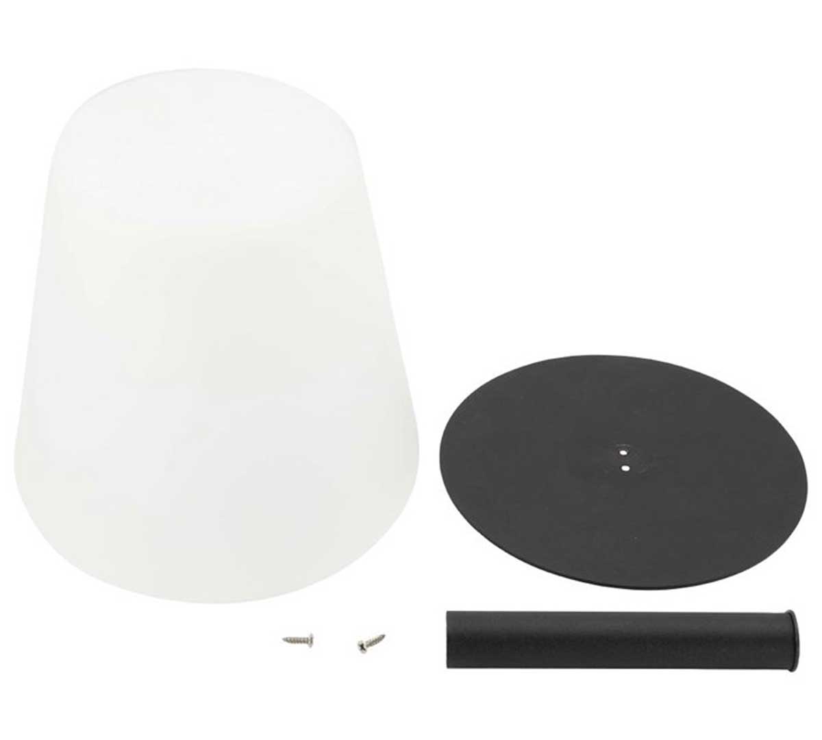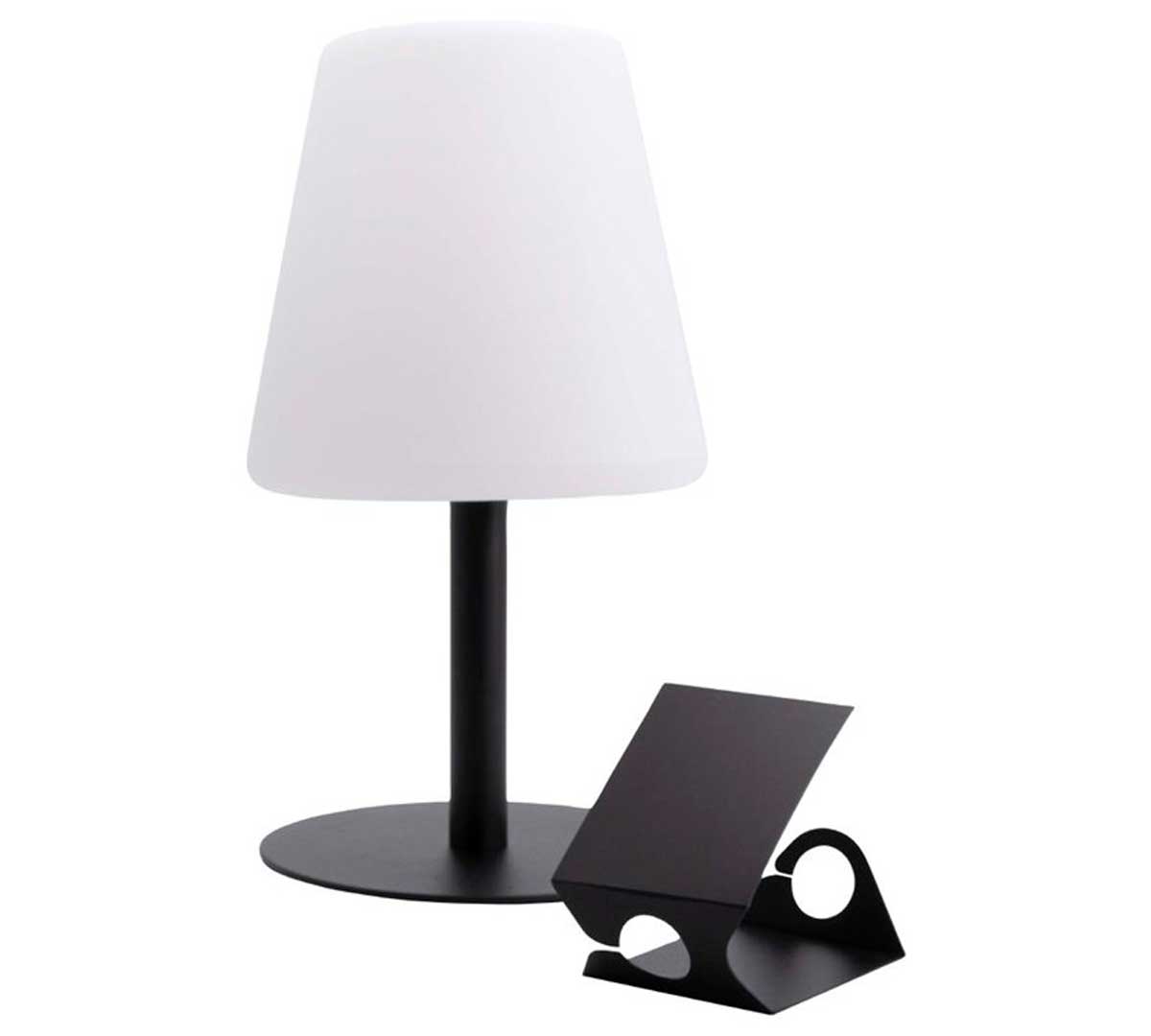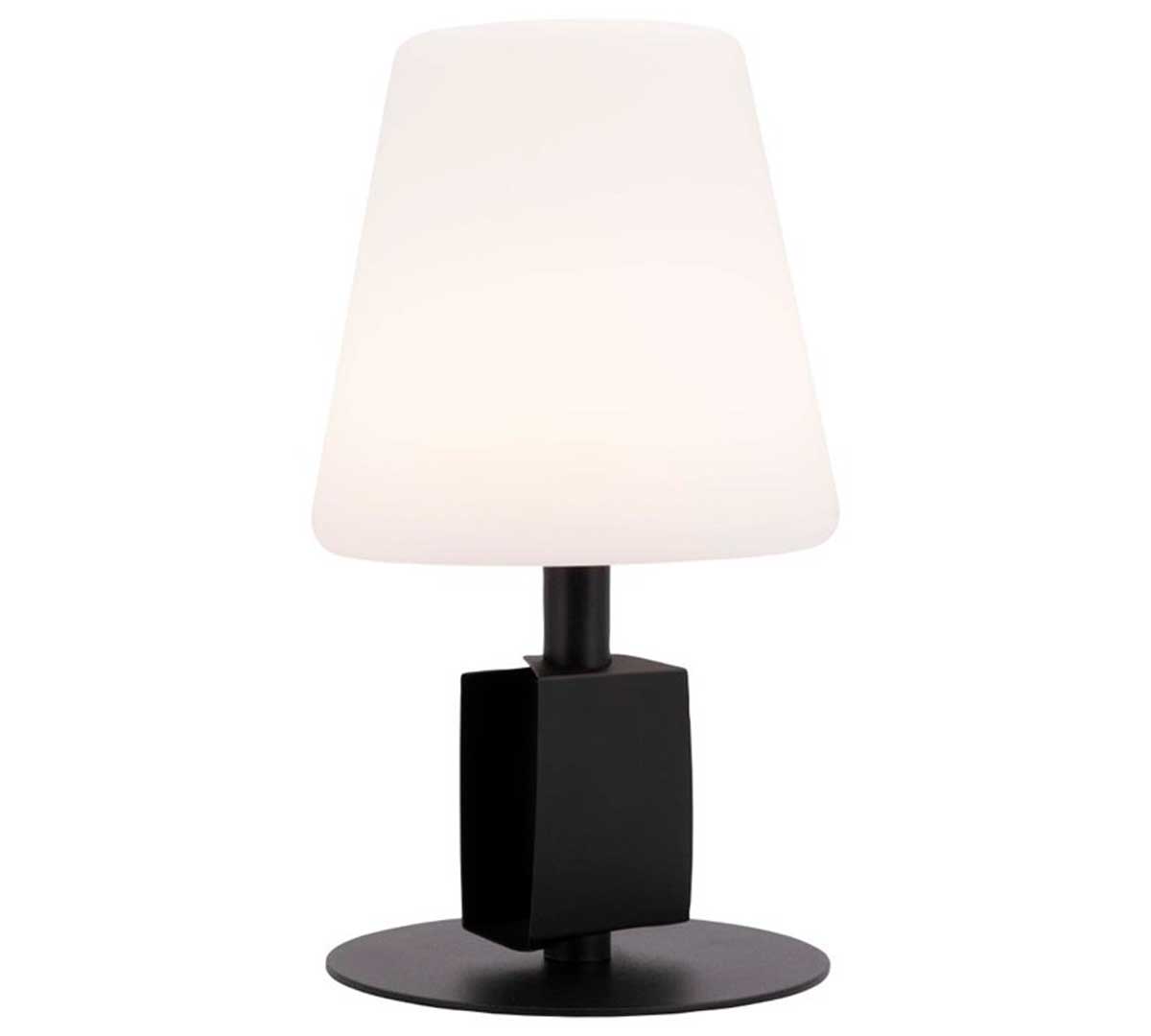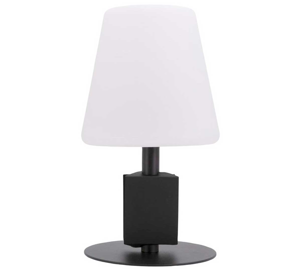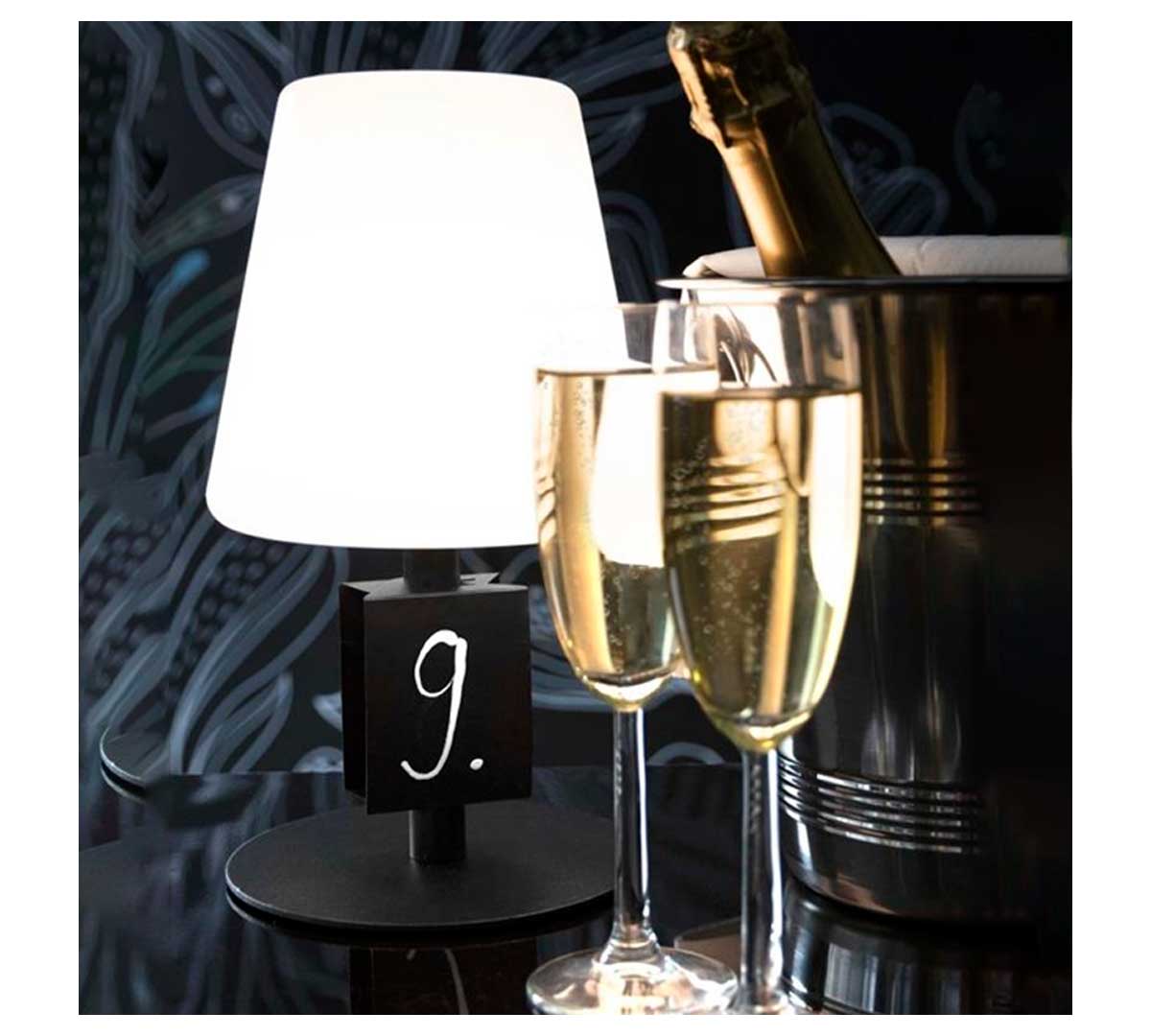 Lámpara de mesa LED inalámbrica con batería recargable de hasta 20 horas. Luz blanca cálida regulable e índice IP44. Diseñada para mesas de restaurantes, bares y terrazas. Incluye etiquetas de pizarra intercambiables para personalizar la comunicación con el cliente.
