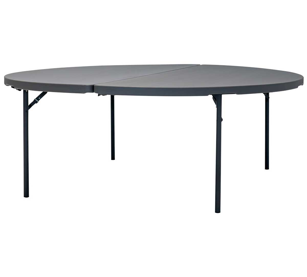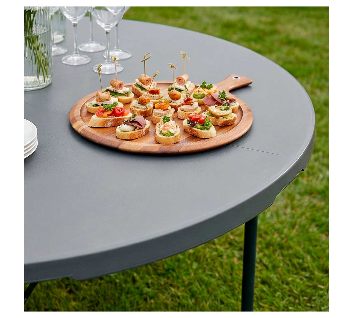 Mesa plegable redonda de gran capacidad. Fácil de transportar y almacenar gracias a su diseño abatible y asas integradas. Incluye bloqueo de seguridad y tacos en las patas.