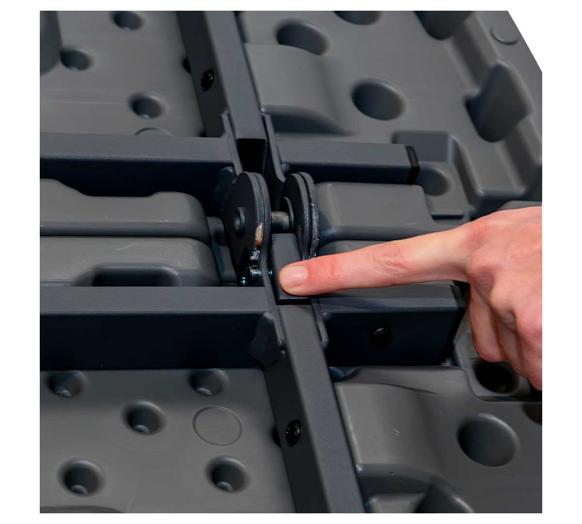 Incluye un novedoso sistema manual con argollas autodeslizantes que previene el plegado involuntario de la mesa plegable Planet200, mejorando la seguridad durante su manipulación y transporte.
