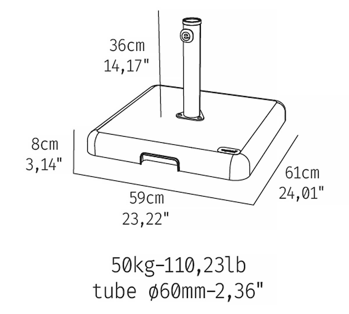 Base cuadrada de hormigón con carcasa de polipropileno. El tubo es de acero lacado con un diámetro de 60 mm. Incluye ruedas. Recomendamos utilizar las ruedas para traslados ocasionales, no están diseñadas para uso intensivo. Con asa en la base.