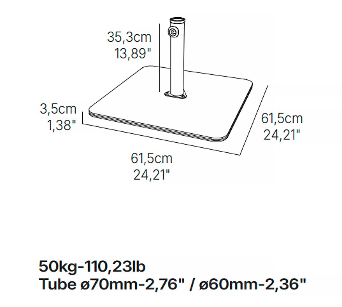 Base de parasol con cruceta y tacos fabricada en hierro con tratamiento antióxido mediante cataforesis, lo que mejora su resistencia frente a la corrosión y al uso en exteriores. Incorpora tornillería de acero inoxidable para mayor durabilidad. Sus medidas son 61,5 x 61,5 cm. La base tiene 3 chapas. El alto con las chapas, la cruceta y los tacos es de 3,5 cm.