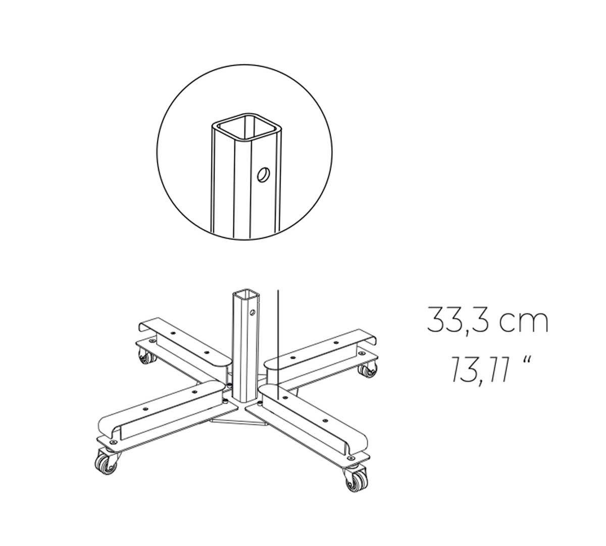 Base de hierro con 4 piedras de hormigón y polipropileno. Compatible con el Parasol Rio con Volantes y el Parasol Rio sin Volantes. Las piedras y las ruedas están incluidas. Se recomienda utilizar las ruedas para traslados ocasionales, no están diseñadas para uso intensivo.