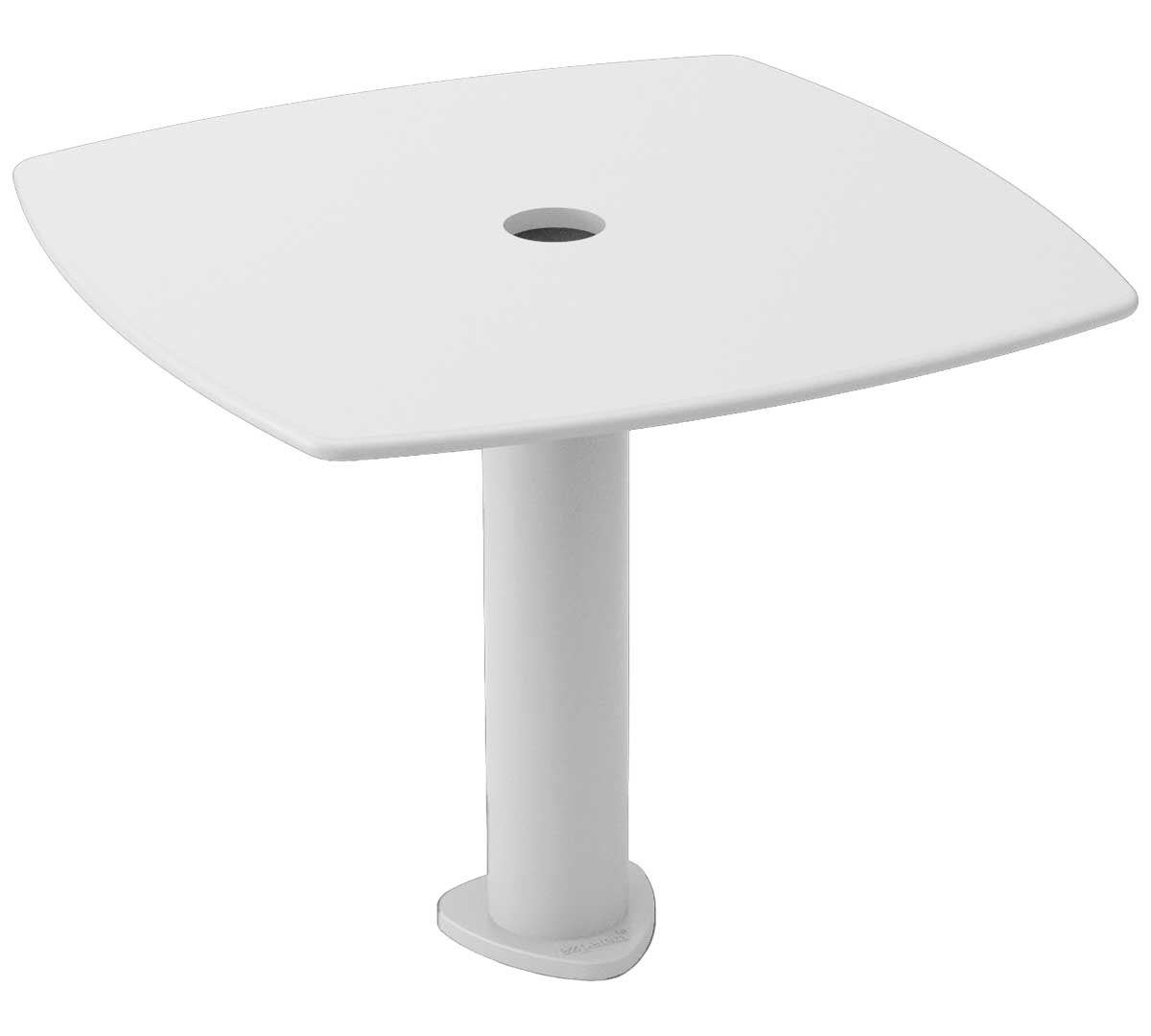 Esta mesa se incorpora a las bases Loop, Canto o Bond con tubo ø 60 mm, permitiendo crear prácticos puntos de apoyo alrededor de los parasoles. Ofrece una superficie estable donde colocar consumiciones, cartas, elementos decorativos o dispositivos personales, mejorando la comodidad del cliente mientras disfruta de la sombra en terrazas y espacios exteriores.