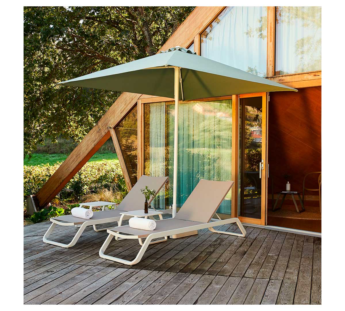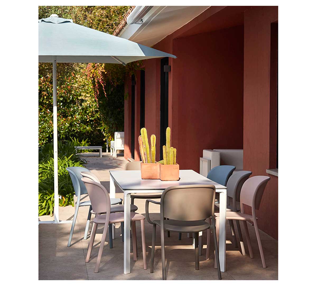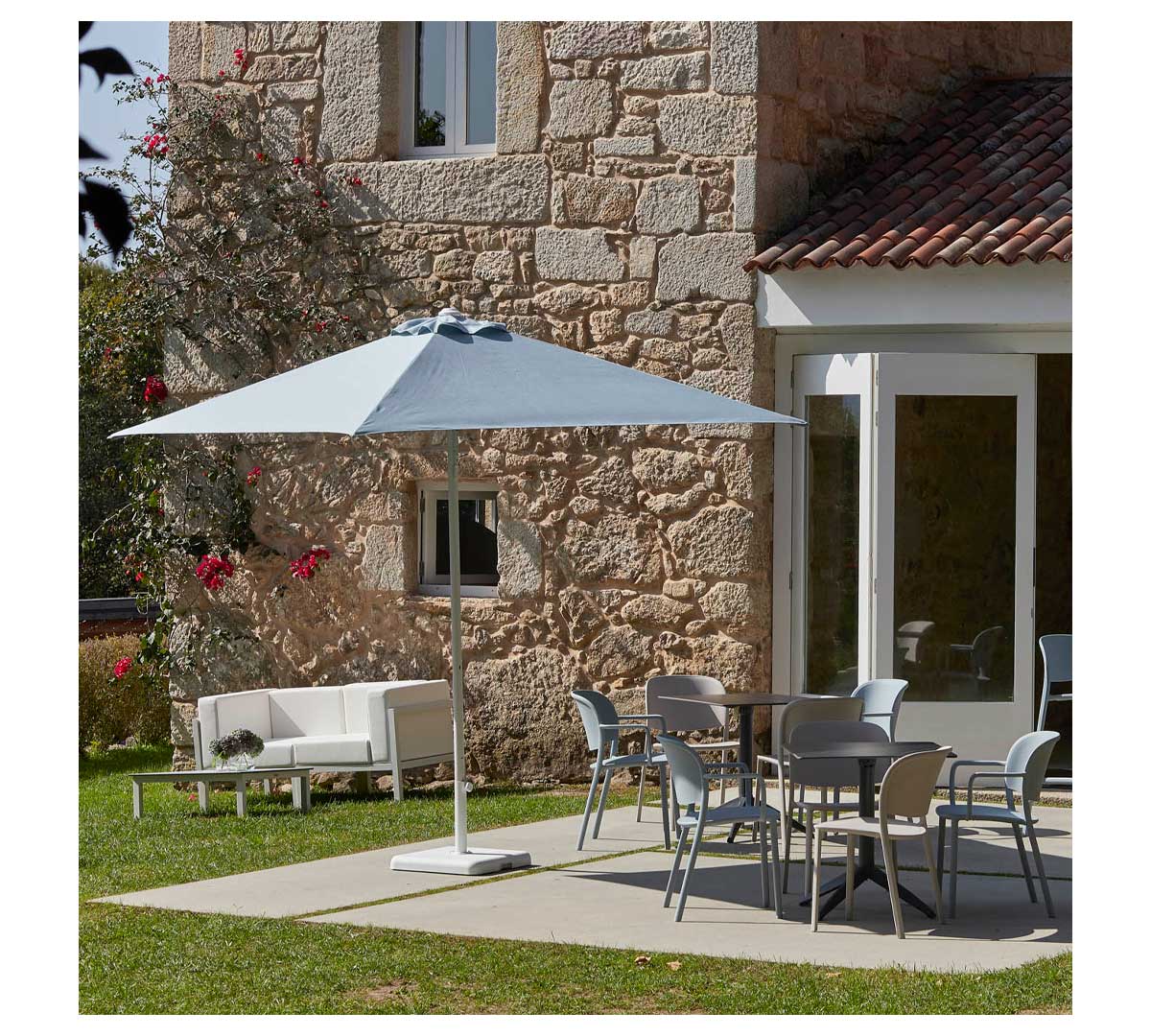 Su formato de 250 x 250 cm permite cubrir cómodamente una mesa de cuatro comensales o pequeñas agrupaciones de mobiliario exterior. También resulta adecuado para patios, jardines privados, zonas de piscina y espacios contract donde se valore un equilibrio entre estética, durabilidad y protección solar.