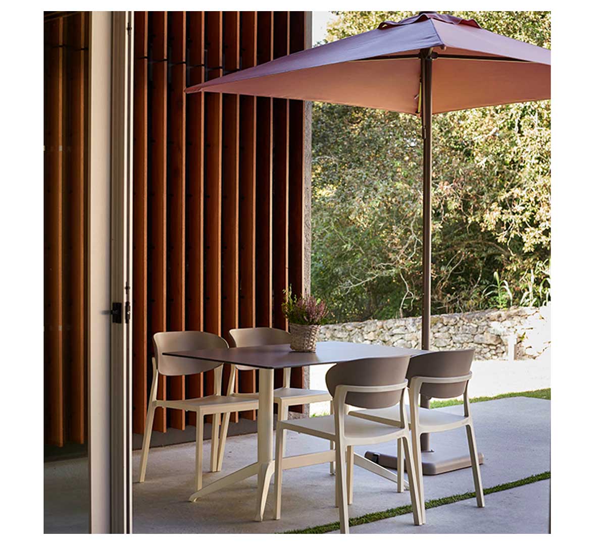 Este parasol de jardín está especialmente indicado para terrazas de restaurantes, cafeterías, hoteles y zonas exteriores donde se requiera una sombra eficaz en un espacio contenido, como mesas de comedor, rincones lounge o áreas de espera.