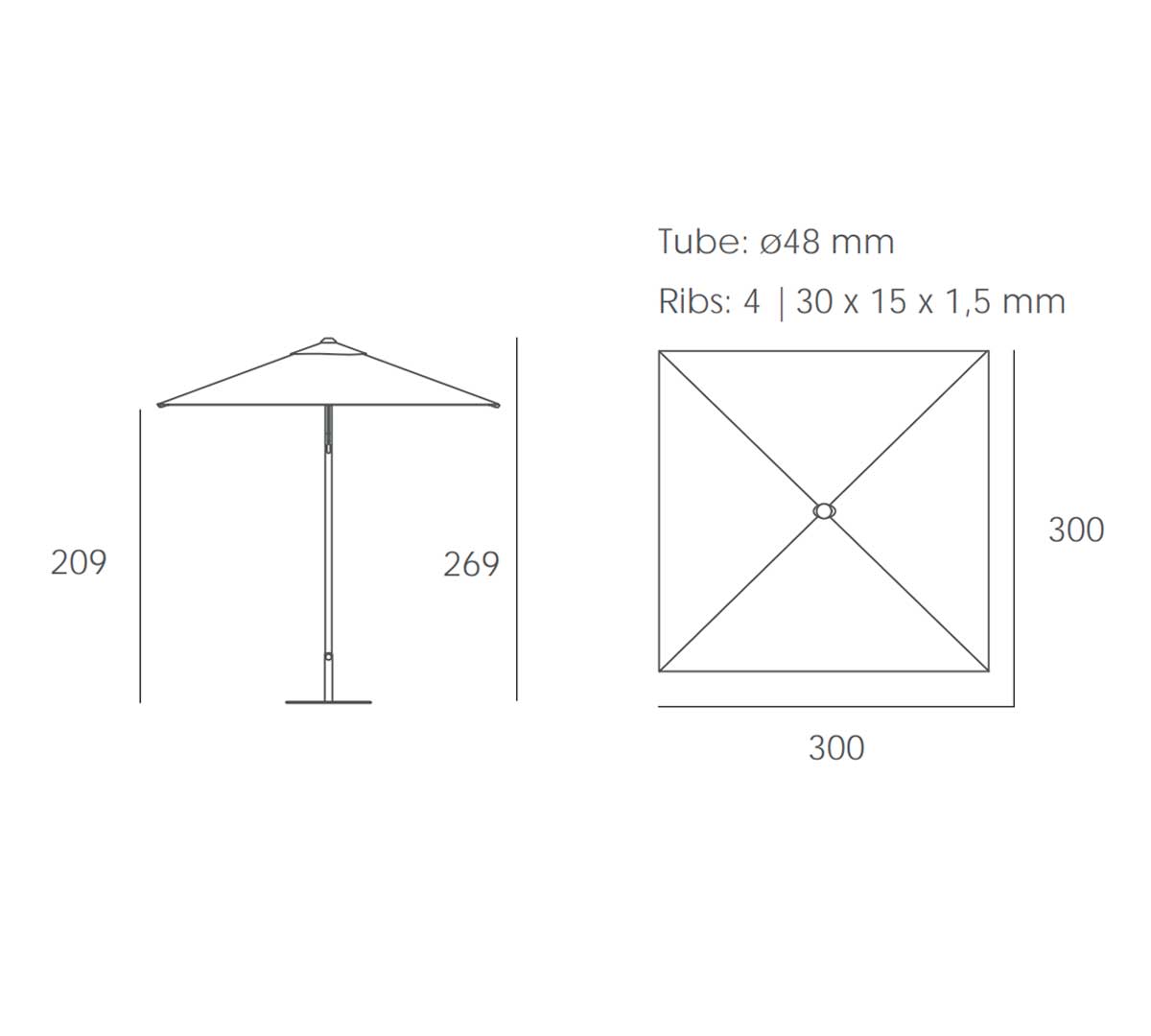 Sombrilla cuadrada sin volantes y con medidas 3 x 3 m. El mástil de aluminio en color blanco, antracita o taupe. Con sistema de apertura y cierre push-up con pulsador de bloqueo. El telaje es en tejido sunbrella con fibras acrílicas y está disponible en 3 colores. La base no está incluida. Consulta las bases disponibles.