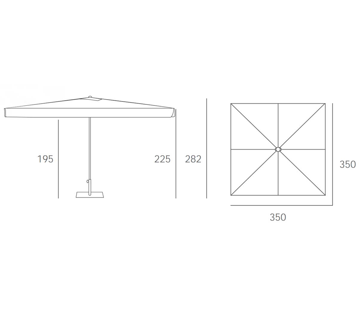 Sombrilla cuadrada de aluminio con 8 varillas. Tiene el mástil en color blanco o antracita. Sin volantes y con fugavientos. El sistema de apertura es por poleas. El telaje es de olefin y está disponible en 14 colores. La base no está incluida. Consulta las bases disponibles.