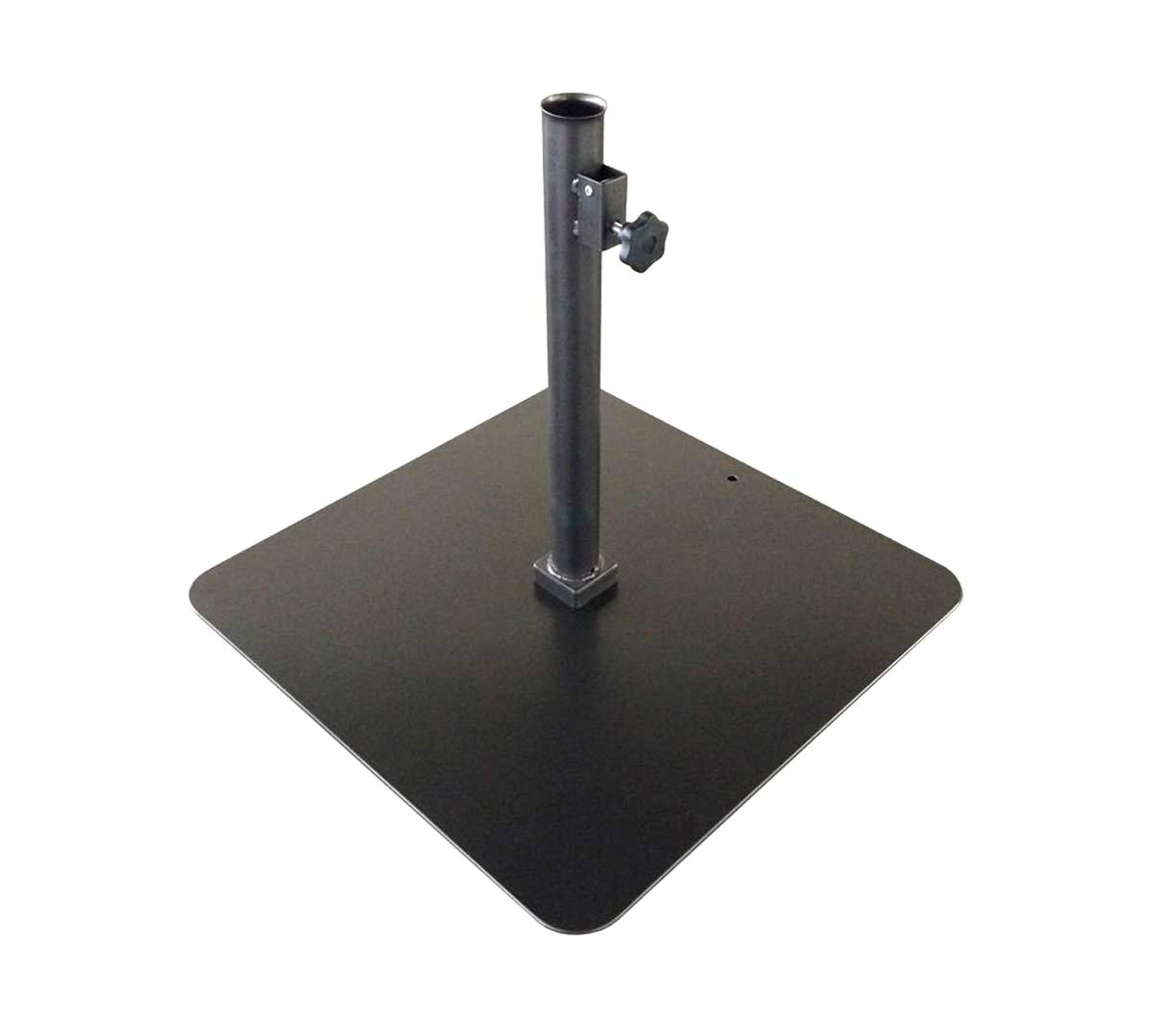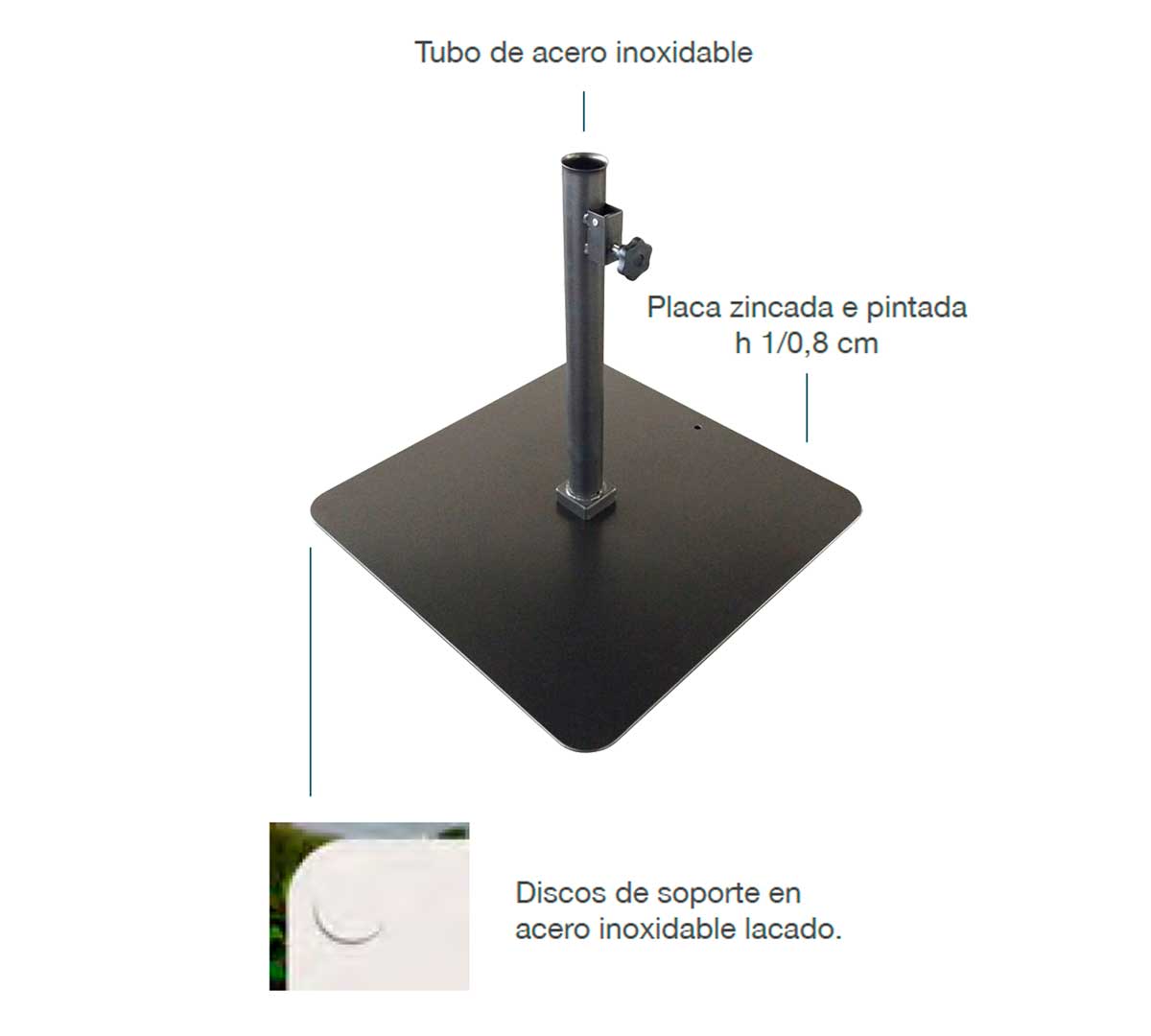 Base para parasol cuadrada con placa zincada y pintada y tubo de acero inoxidable. Los ángulos están redondeados. Proporciona estabilidad y resistencia para parasoles con una cobertura de más de 10 m².