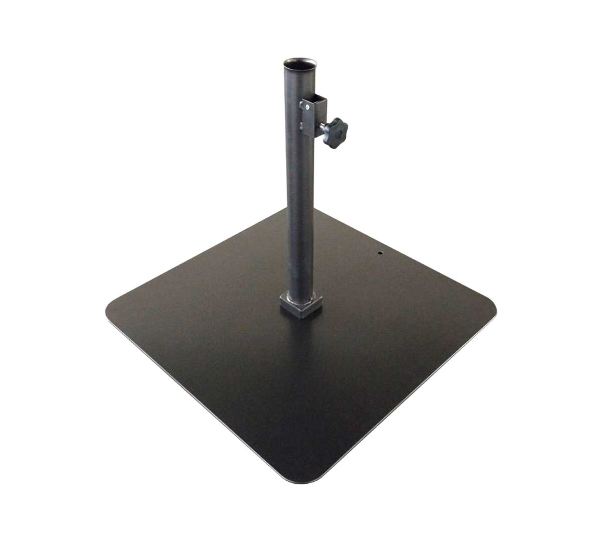 Base para parasol cuadrada con placa zincada y pintada y tubo de acero inoxidable. Los ángulos están redondeados. Proporciona estabilidad y resistencia para parasoles con una cobertura de hasta 10 m².