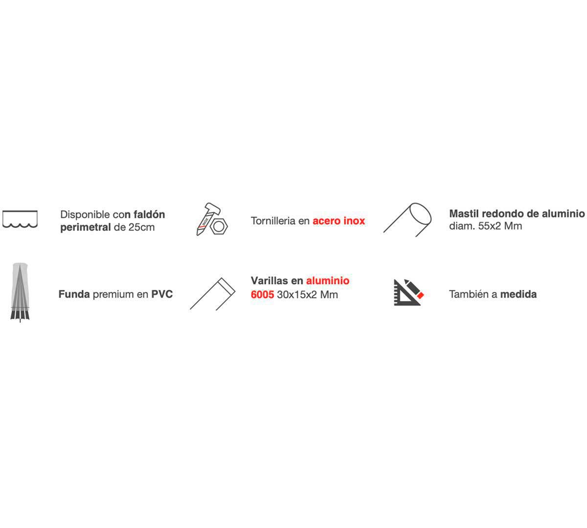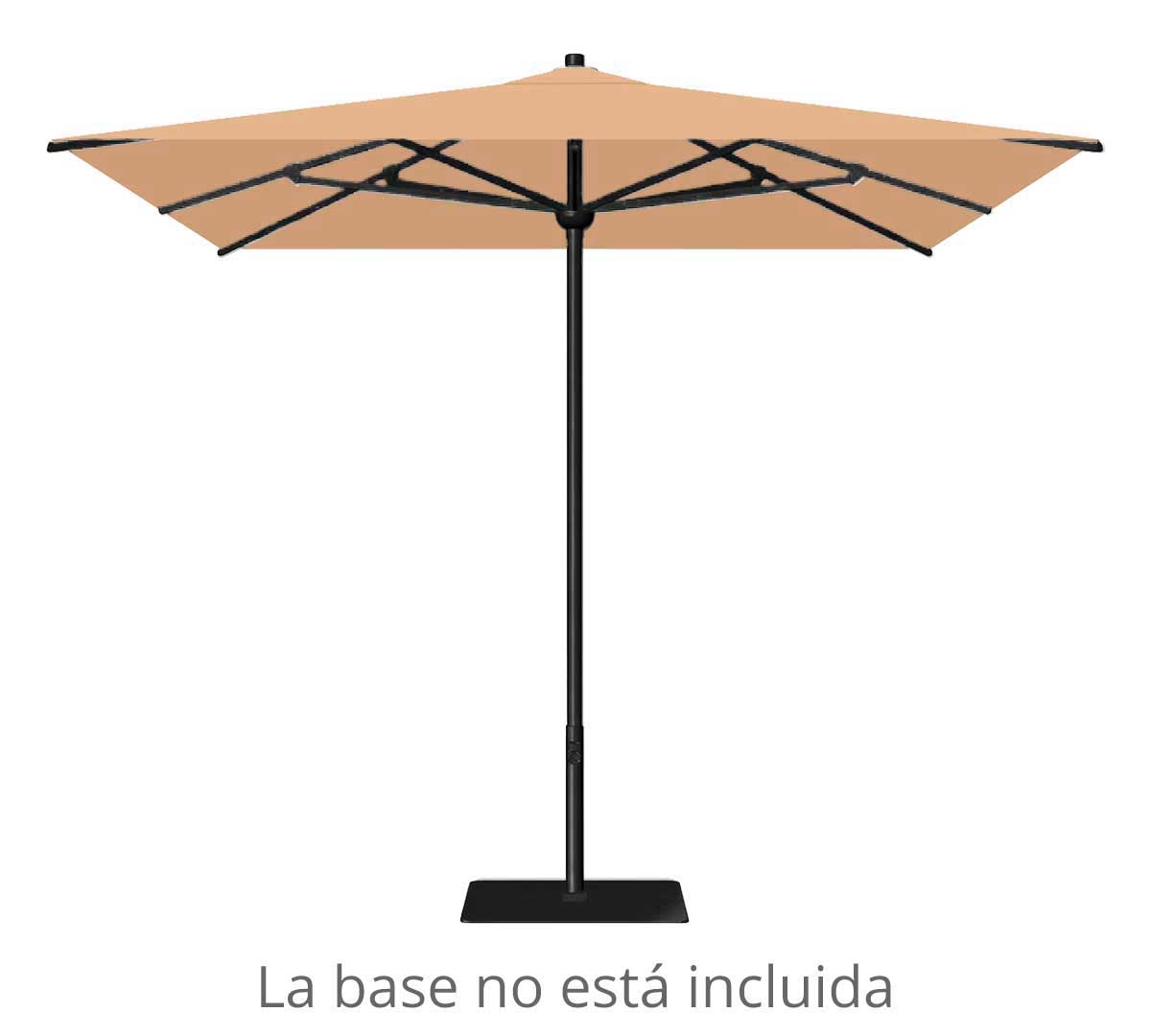 Parasol de mástil central con estructura de aluminio, tornillería en acero inoxidable y 4 varillas. Apertura fácil mediante sistema de polea y costuras protegidas para mayor impermeabilidad. El telaje es en tejido náutico resinado impermeable de 390 g/m². Tiene una cobertura de espacios y terrazas hasta 4 m². Incluye funda en PVC. La base no está incluida. Consulta las bases disponibles.