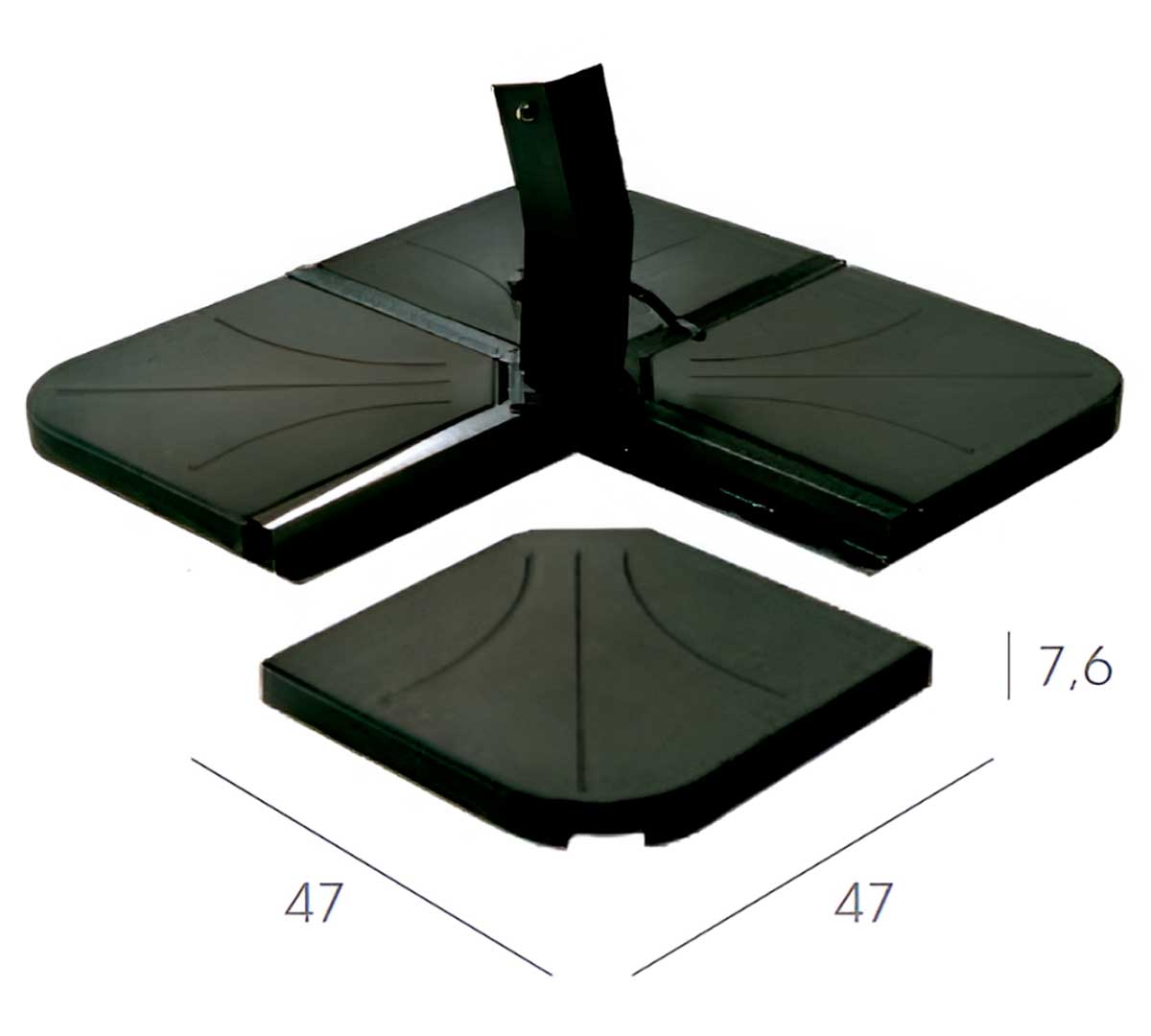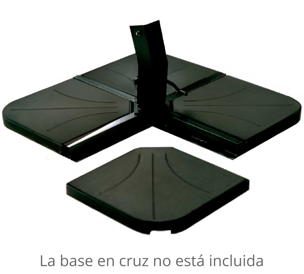 En parasoles de mayor tamaño o con mástil lateral (que generan mayor palanca), normalmente se recomiendan 4 losas colocadas sobre una base en cruz para asegurar la máxima estabilidad.