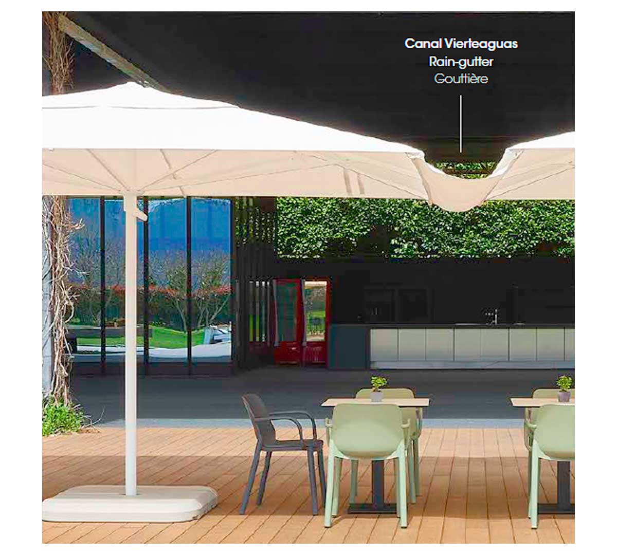 Ideal para terrazas, patios y espacios al aire libre donde se instalen varios parasoles próximos entre sí, proporcionando una solución eficaz para canalizar el agua y mantener la zona seca y protegida.