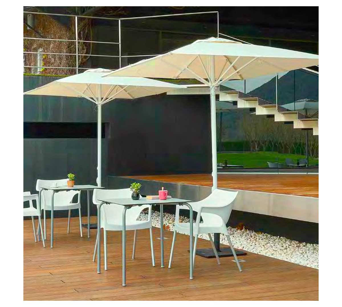 Este parasol es ideal para crear zonas de sombra en terrazas, patios y jardines, proporcionando un ambiente confortable tanto en restaurantes como en cafeterías o espacios de relax en exteriores.