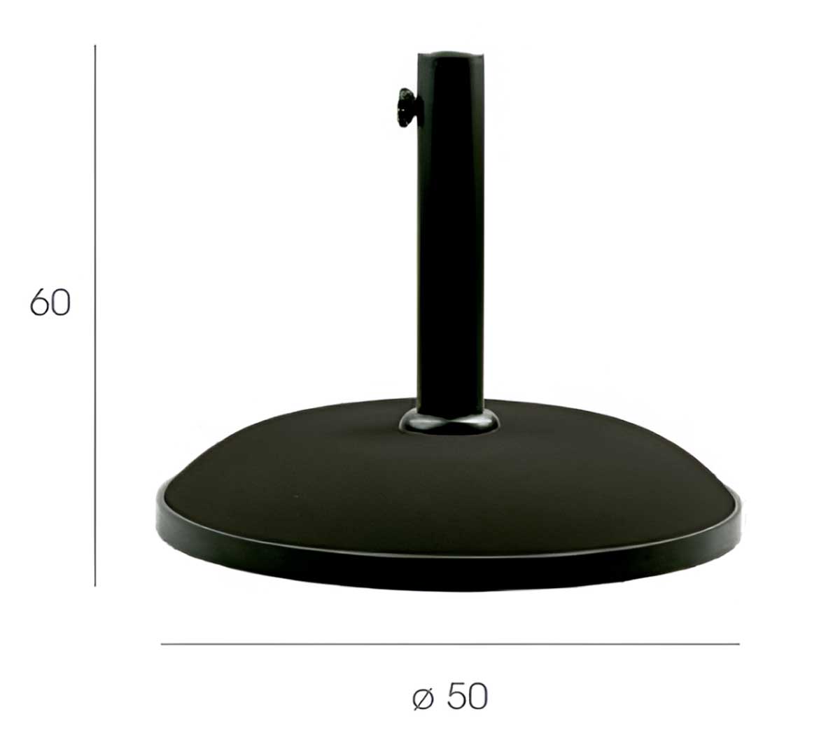 Base para sombrillas de color negro. Fabricada con base de cemento y estructura de acero con aro protector de caucho. Apta para mástiles con un diámetro de 38 a 61 mm. Tiene un peso de 25 kg.
