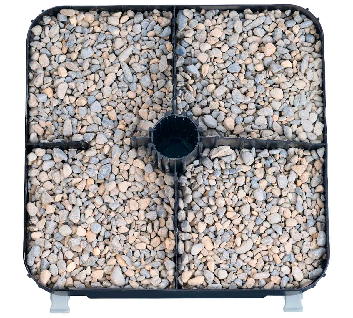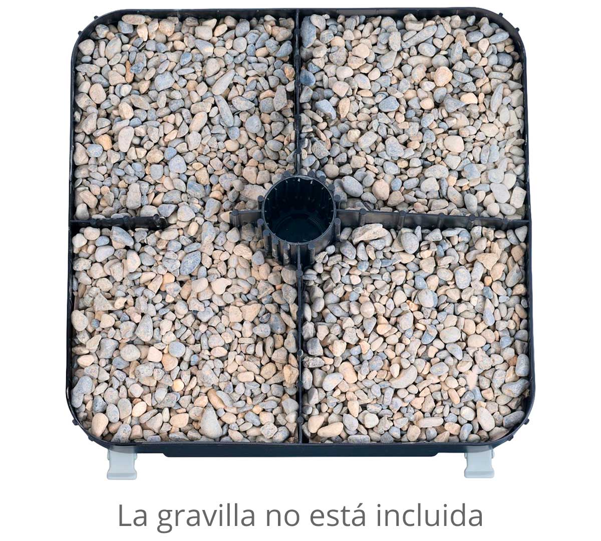 Base rellenable de arena o grava con 4 ruedas, apta para mástiles de 35 a 39 mm de diámetro. No rellenar con líquidos. Facilita el desplazamiento y la estabilidad de sombrillas en terrazas o exteriores. Recomendamos utilizar las ruedas para traslados ocasionales, no están diseñadas para uso intensivo.