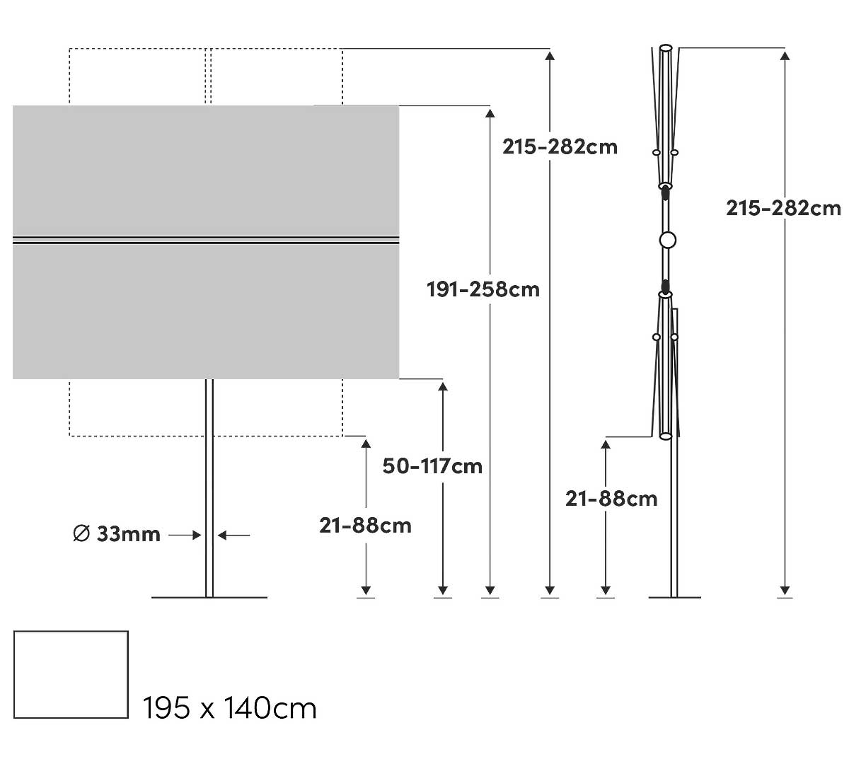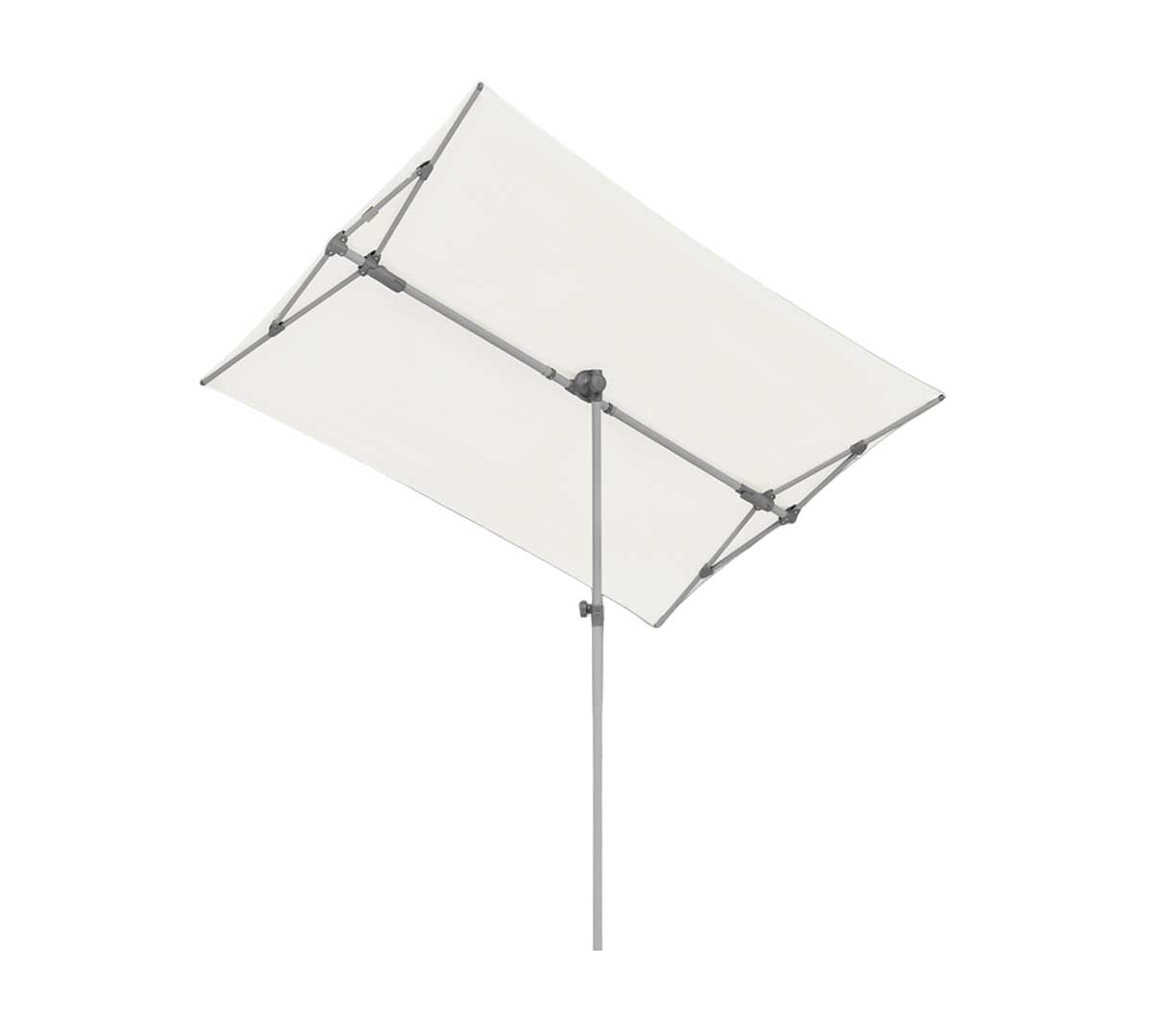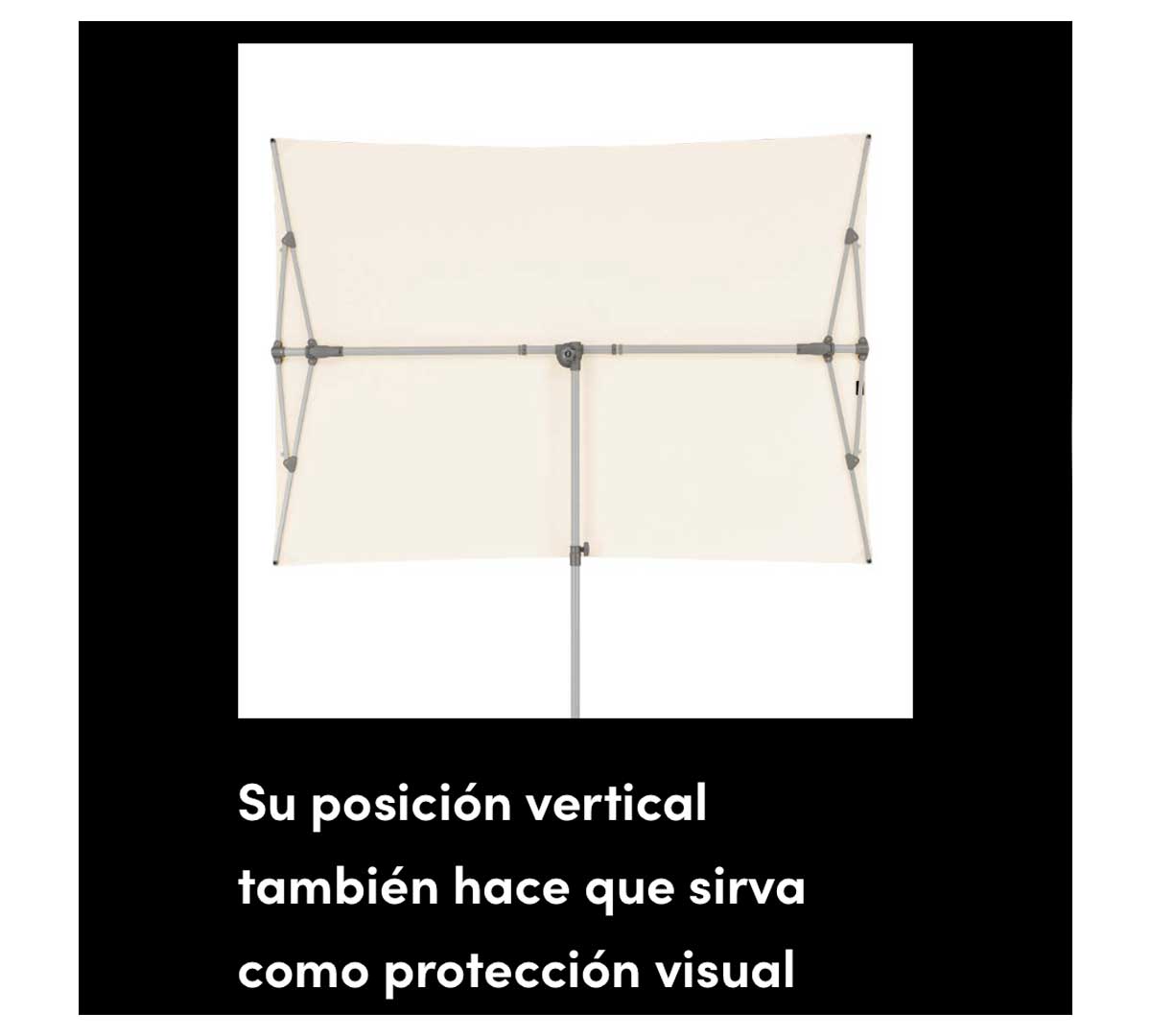 Sombrilla rectangular que combina protección solar y visual en espacios reducidos. El telaje está fabricado con tejido resistente a los rayos UV y la estructura es de aluminio. Se puede inclinar, girar y deslizar 360° para seguir la posición del sol y maximizar la sombra. Tiene ajuste continuo de altura y puede usarse en posición vertical como pantalla de privacidad. La base no está incluida. Consulta las bases disponibles.