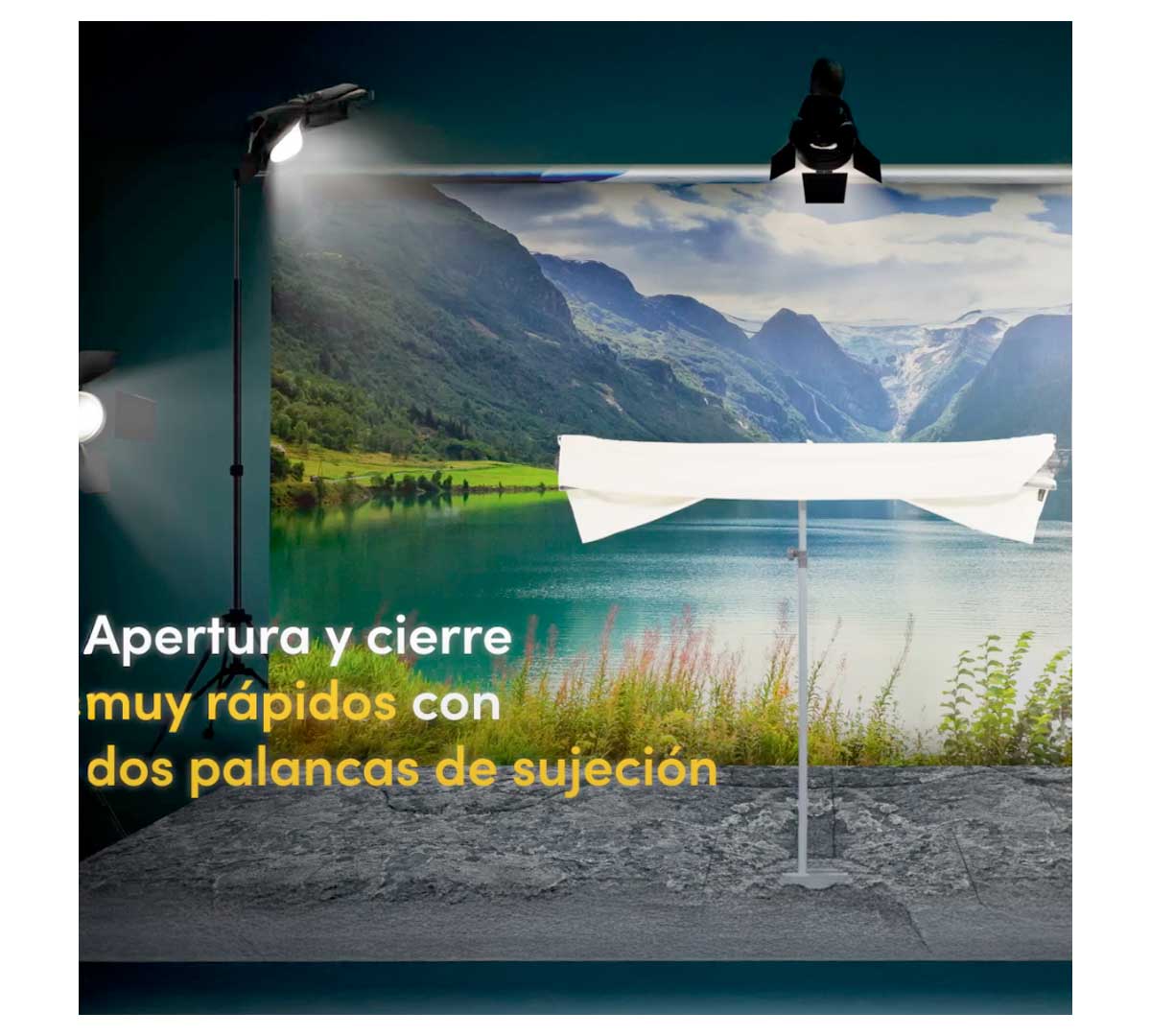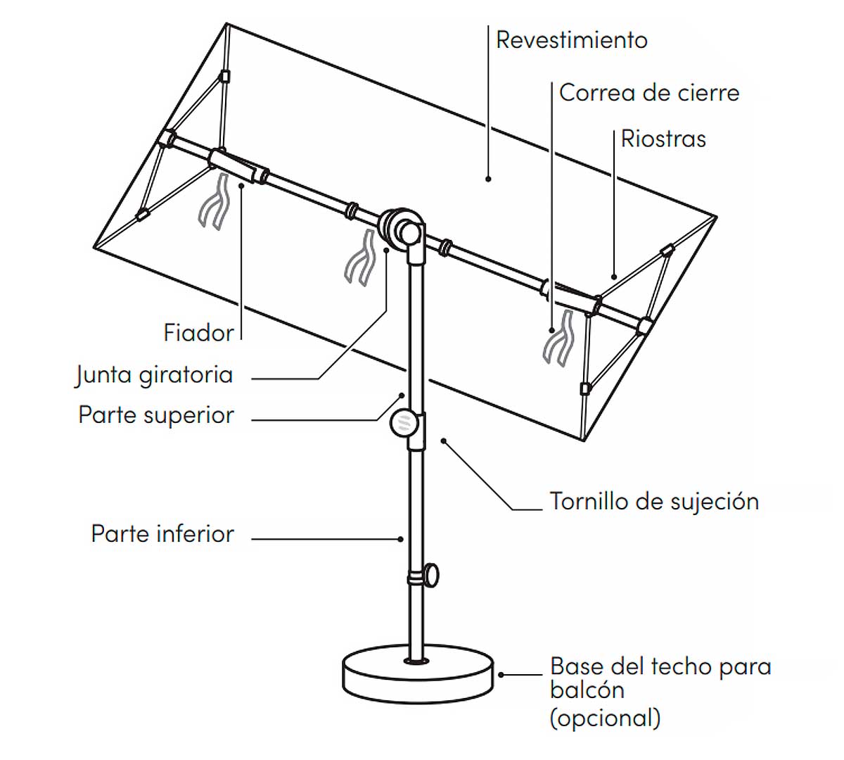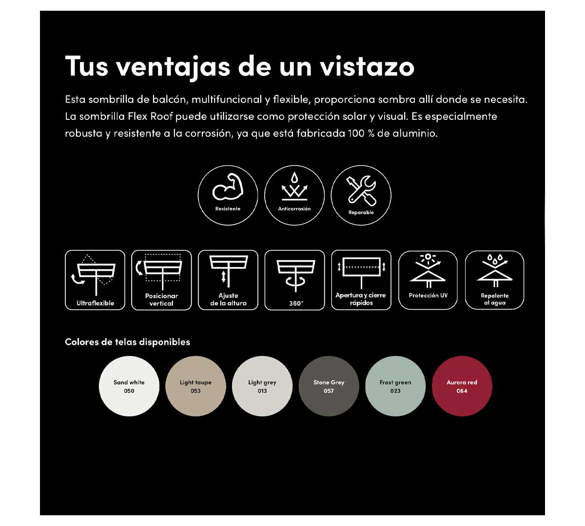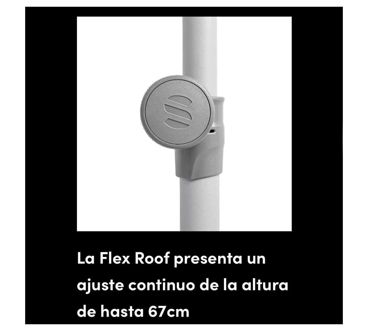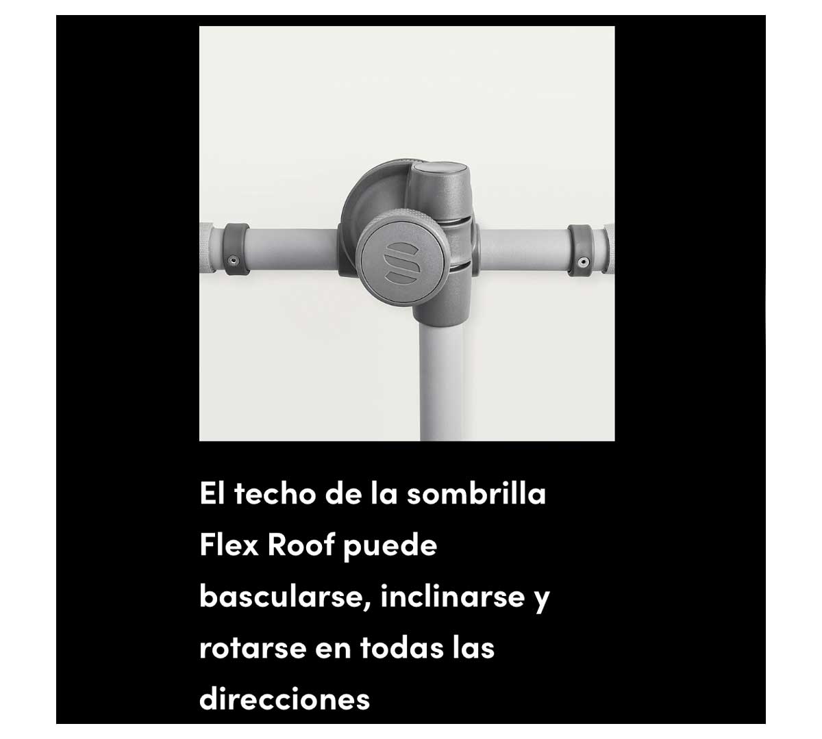 Tiene un ajuste continuo, es resistente a los rayos UV, y se puede inclinar, rotar y deslizar 360° en todas las direcciones. Al colocar el techo de la sombrilla en vertical, se crea una protección visual perfecta.