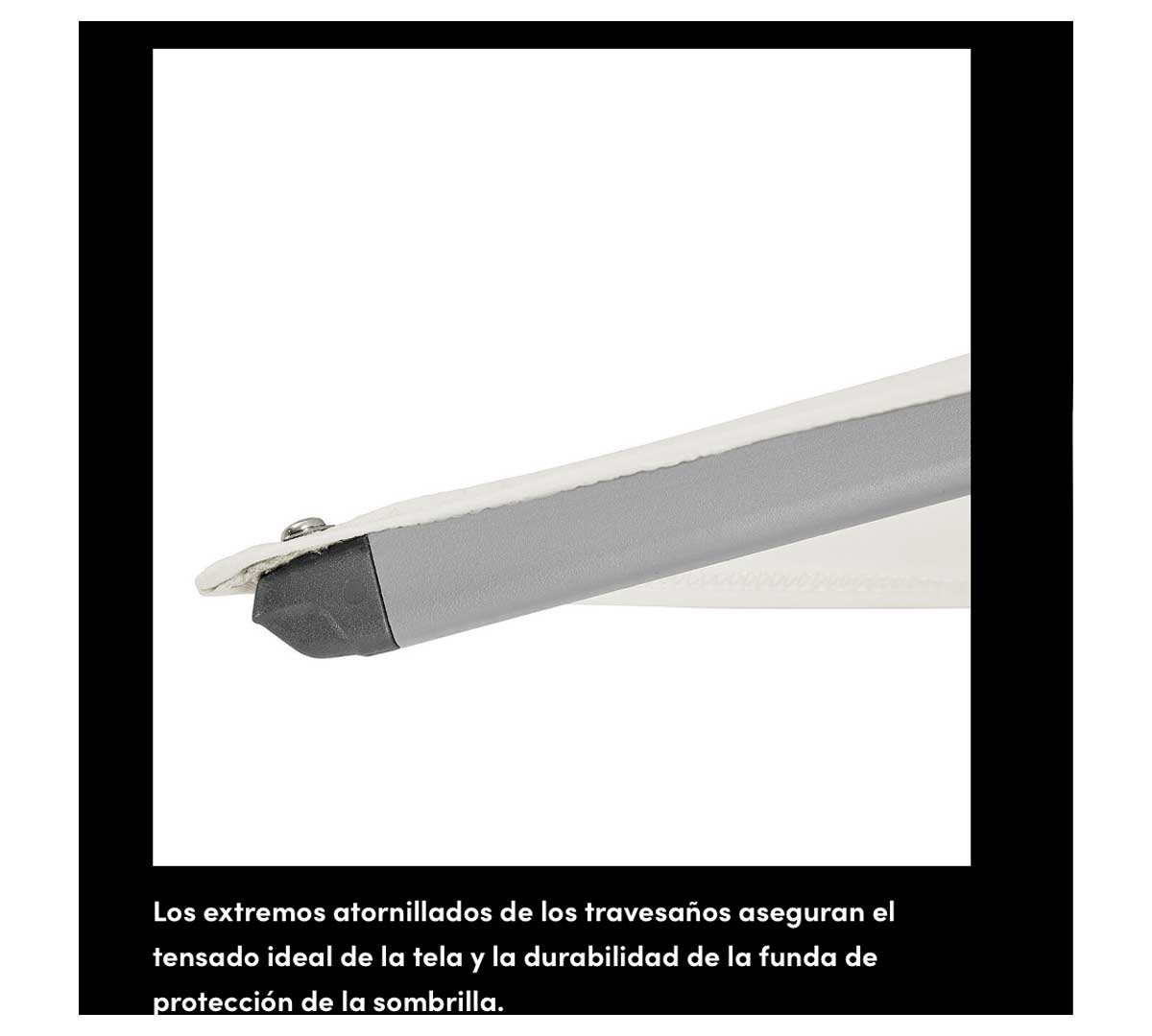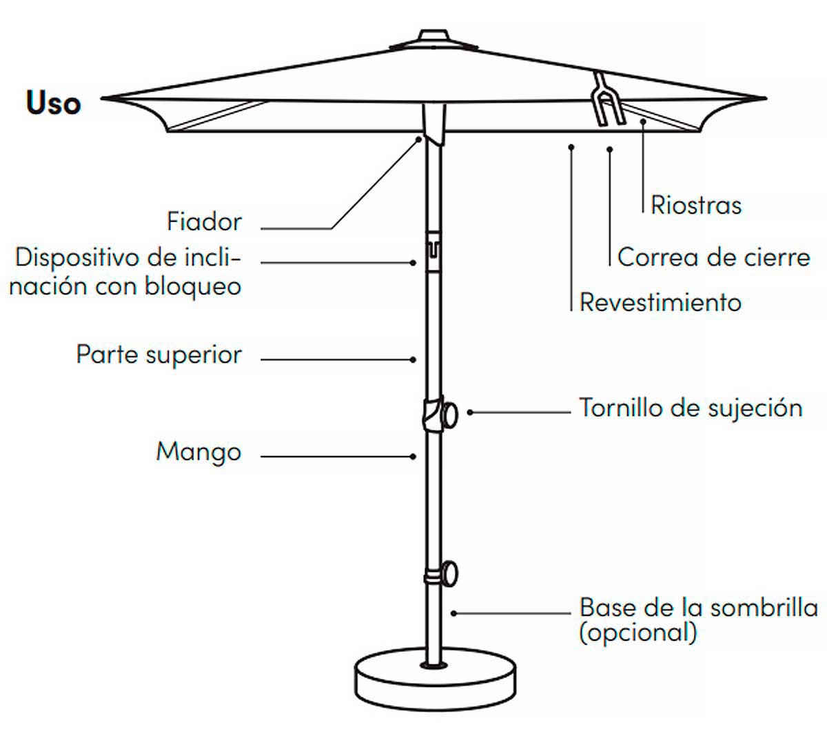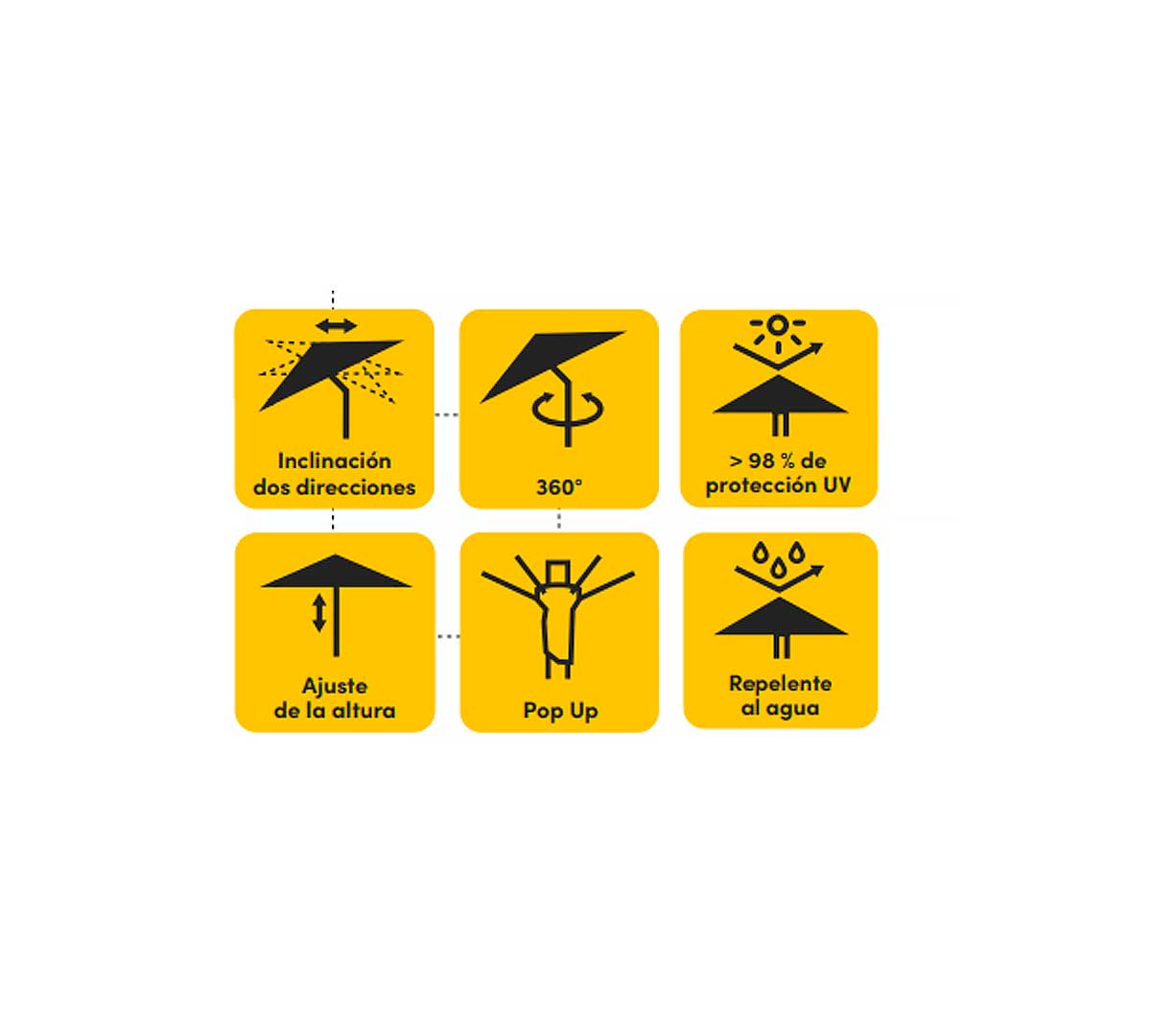 Este parasol está especialmente indicado para su uso en terrazas, jardines, praderas y balcones, donde se requiera una protección solar robusta y versátil. Es perfecto para crear zonas de sombra confortables en espacios exteriores, tanto en entornos residenciales como en áreas de restauración y Hostelería.