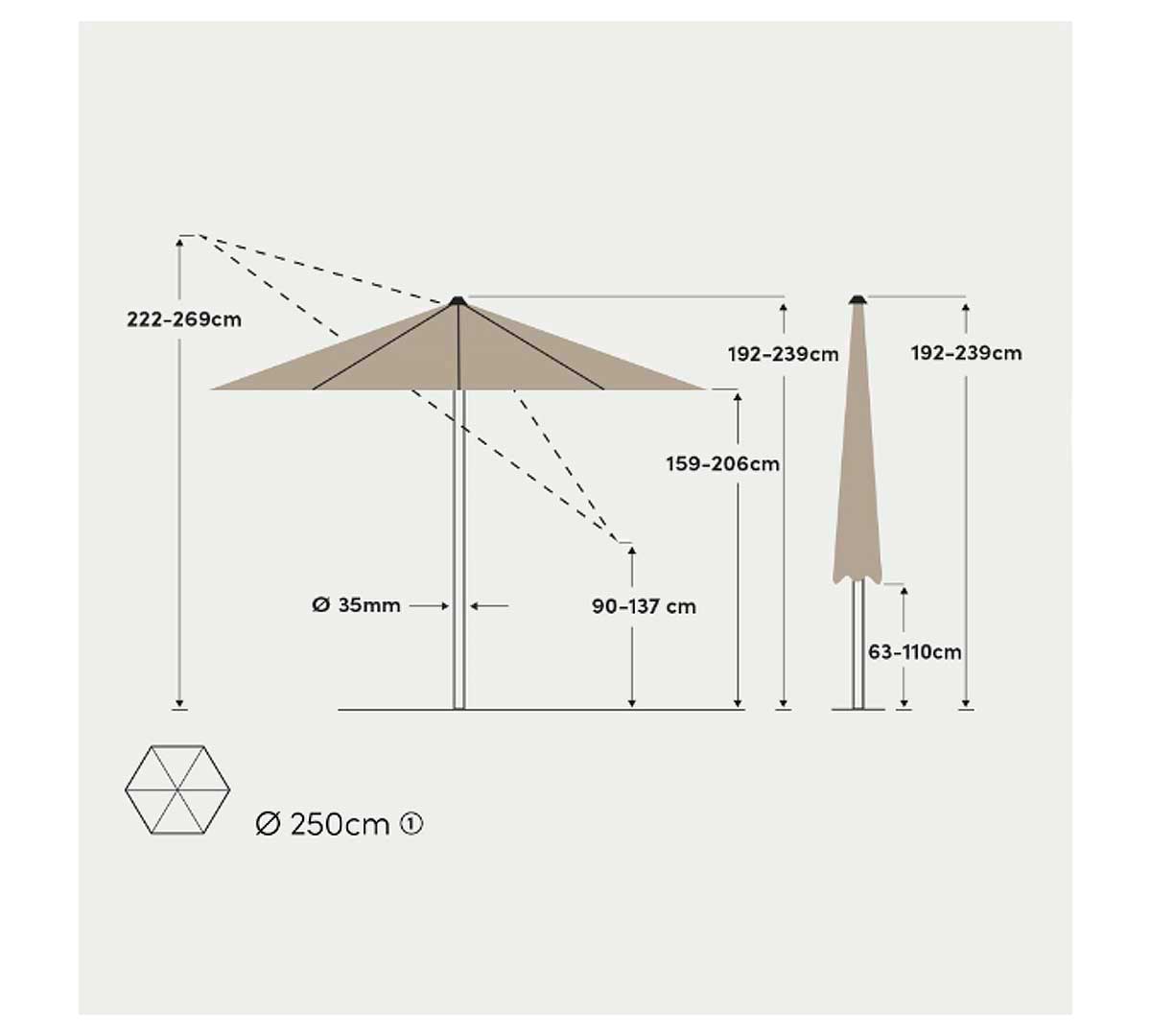 Sombrilla redonda con Ø 2,5 metros que se abre y cierra de forma rápida gracias a su sistema Pop-Up (empuje). Ofrece protección solar con tejido 100 % poliéster de 180 g/m² repelente al agua y con el 98 % de protección UV. Permite ajustar la altura y una inclinación hacia ambos lados. Con estructura de aluminio resistente a la corrosión. La base no está incluida. Consulta las bases disponibles.
