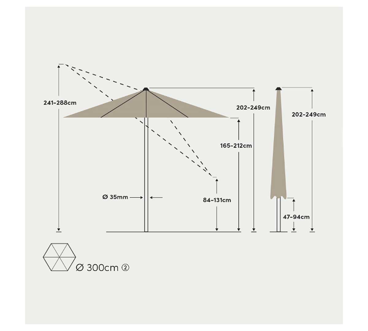 Sombrilla redonda que se abre y cierra de forma rápida gracias a su sistema Pop-Up (empuje). Ofrece protección solar con tejido 100 % poliéster de 180 g/m² repelente al agua y con el 98 % de protección UV. Permite ajustar la altura y una inclinación hacia ambos lados. Con estructura de aluminio resistente a la corrosión. La base no está incluida. Consulta las bases disponibles.