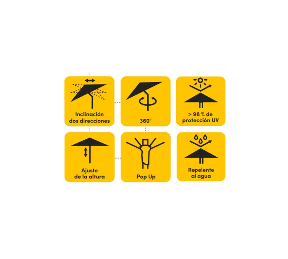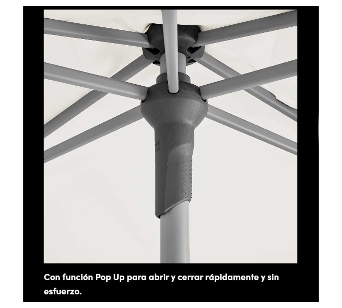 Este parasol, también conocido como sombrilla de mástil central, destaca por su facilidad de uso gracias al sistema Pop Up, que permite abrir y cerrar la estructura de forma rápida y sin esfuerzo, optimizando el tiempo de montaje y recogida.
