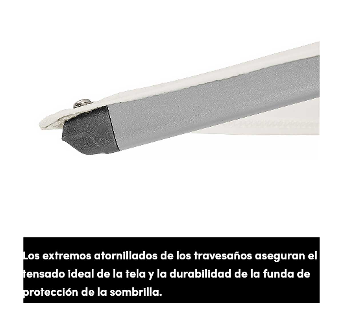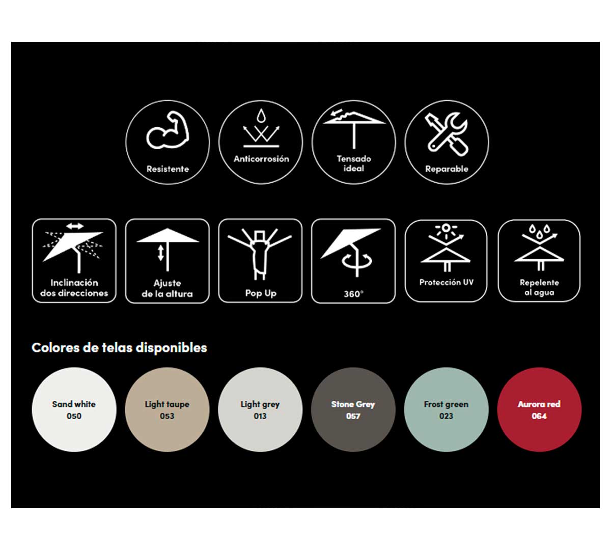 Este parasol gira 360º sobre su base, permitiendo ajustar la orientación según la posición del sol sin necesidad de mover la base, lo cual es muy práctico en espacios exteriores expuestos al sol.