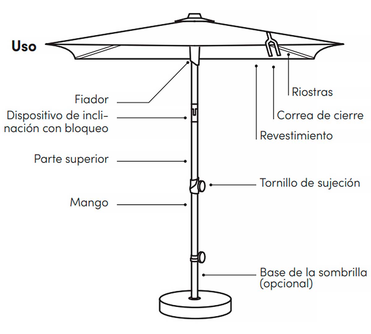 Este modelo es idóneo para su uso en terrazas, balcones, jardines y zonas al aire libre donde se requiera una protección solar eficaz y una solución estética de fácil manejo. Gracias a su ajuste de altura y a la posibilidad de inclinación, se adapta perfectamente a diferentes entornos y necesidades de sombra.