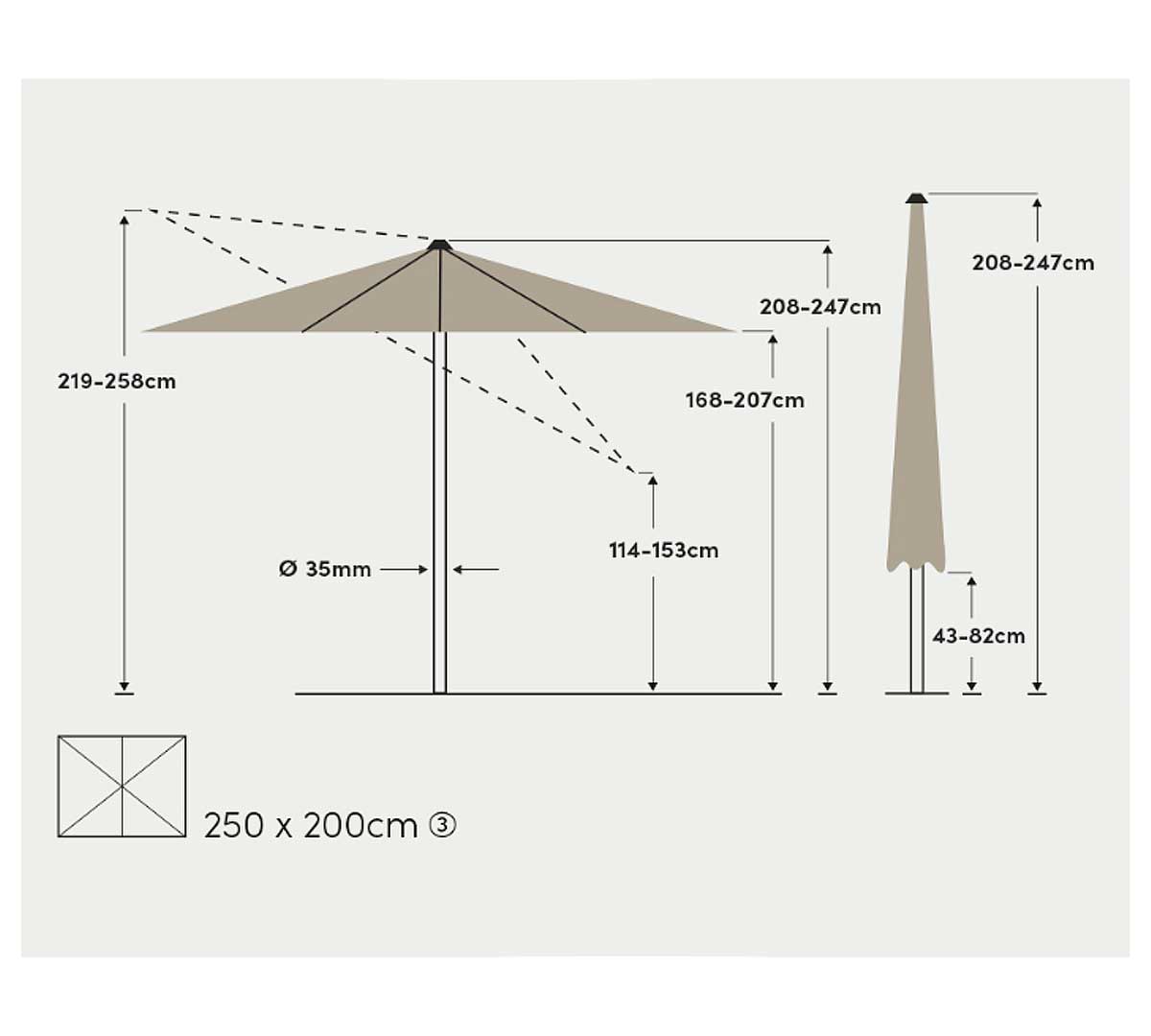 Sombrilla rectangular que se abre y cierra de forma rápida gracias a su sistema Pop-Up (empuje). Ofrece protección solar con tejido 100 % poliéster de 180 g/m² repelente al agua y con 98 % de protección UV. Permite ajustar la altura y una inclinación hacia ambos lados. Con estructura de aluminio resistente a la corrosión. La base no está incluida. Consulta las bases disponibles.