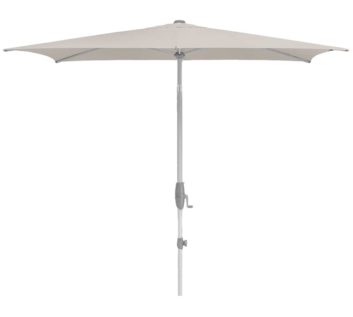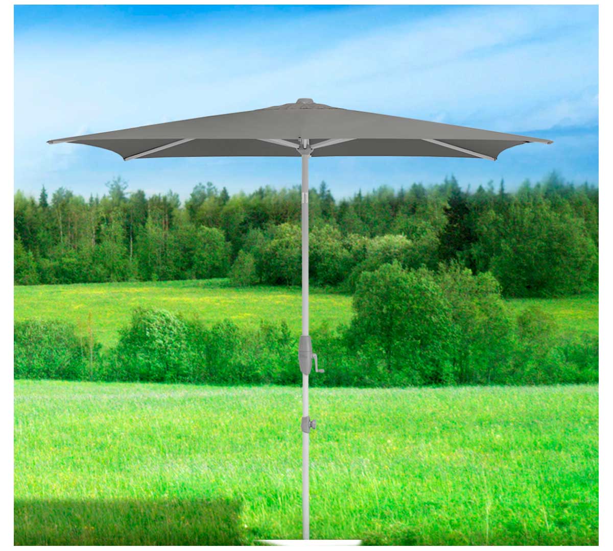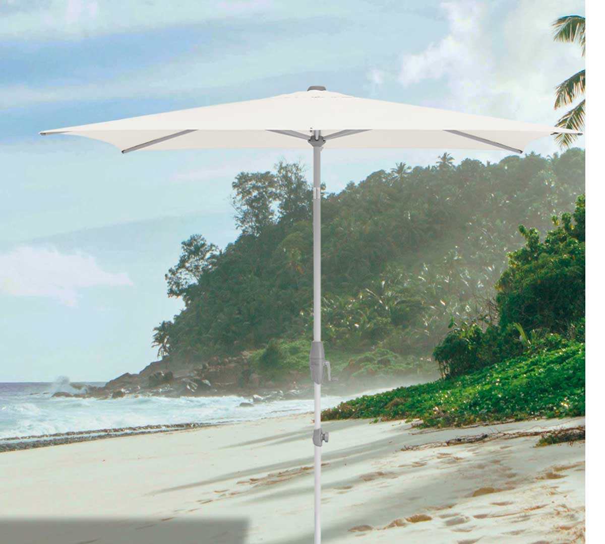 Sombrilla rectangular de mástil central con mecanismo de manivela giratoria que facilita abrir y cerrar con poco esfuerzo y permite inclinar la cubierta de forma continua a la altura de la cadera. Su estructura y mástil de aluminio 100 % la hacen robusta y resistente a la corrosión, y su tejido de poliéster ofrece el 98 % de protección UV. La base no está incluida. Consulta las bases disponibles.