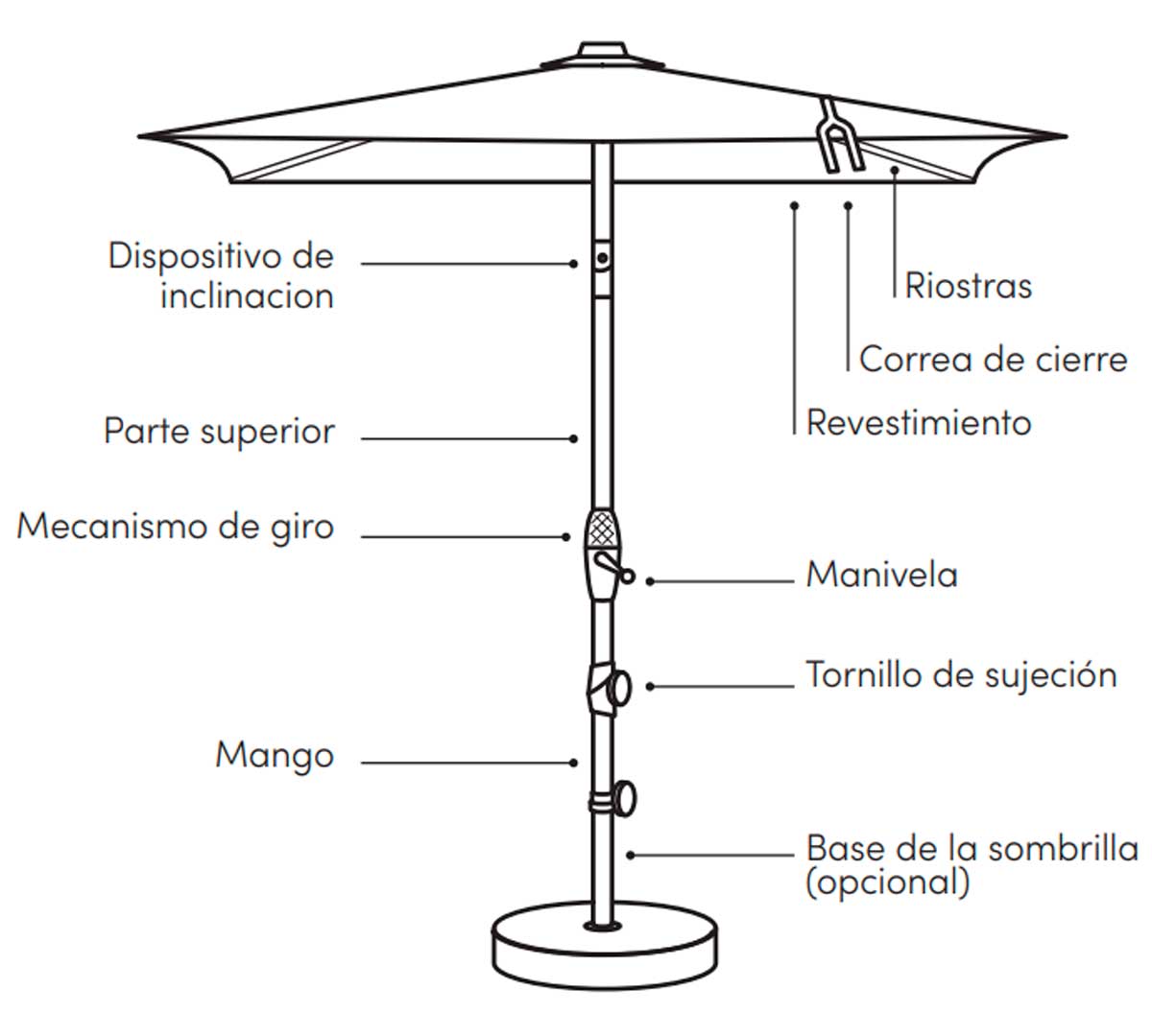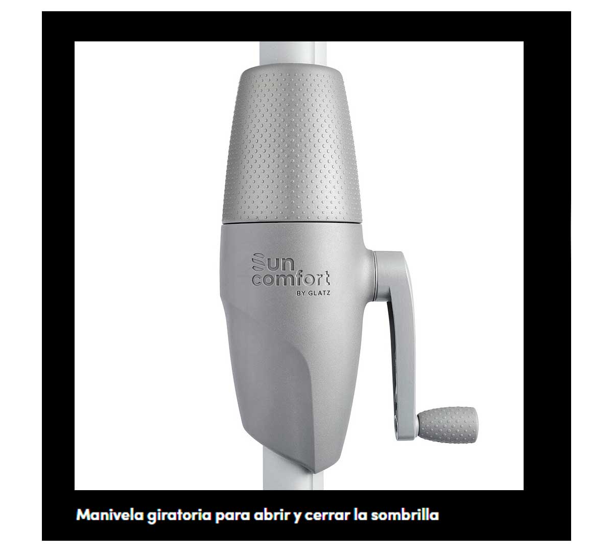 Este parasol se abre y cierra fácilmente con una manivela ergonómica, y su toldo se puede inclinar de forma continua mediante un mecanismo de giro a altura de cadera, lo que permite ajustar la orientación según el ángulo del sol.
