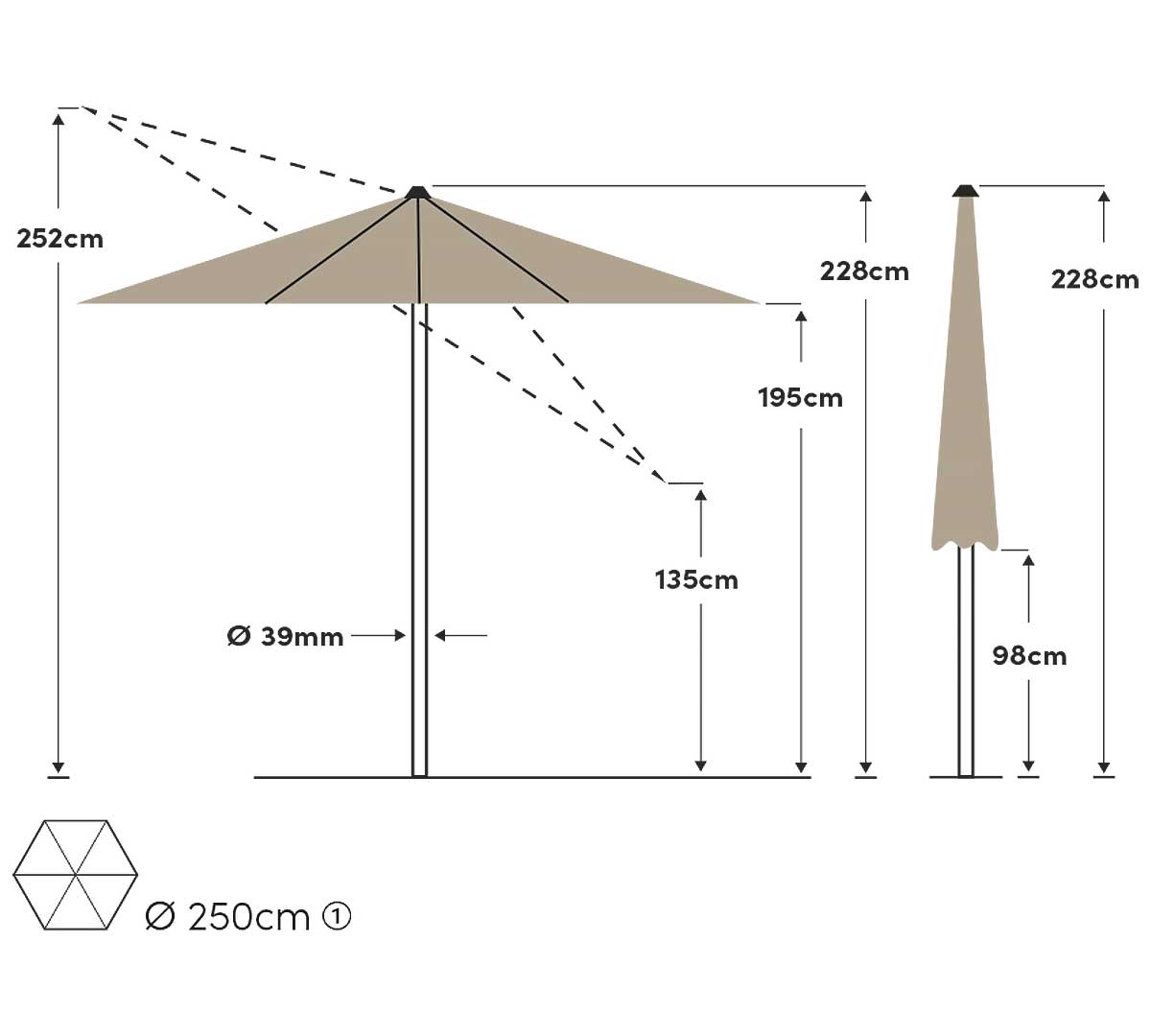 Sombrilla redonda con un diámetro de 2,5 metros que se abre y cierra mediante manivela. Ofrece protección solar con tejido 100 % poliéster de 180 g/m² repelente al agua y con 98 % de protección UV. Permite una inclinación hacia un lado. El mástil es de aluminio y la estructura de acero. La base no está incluida. Consulta las bases disponibles.