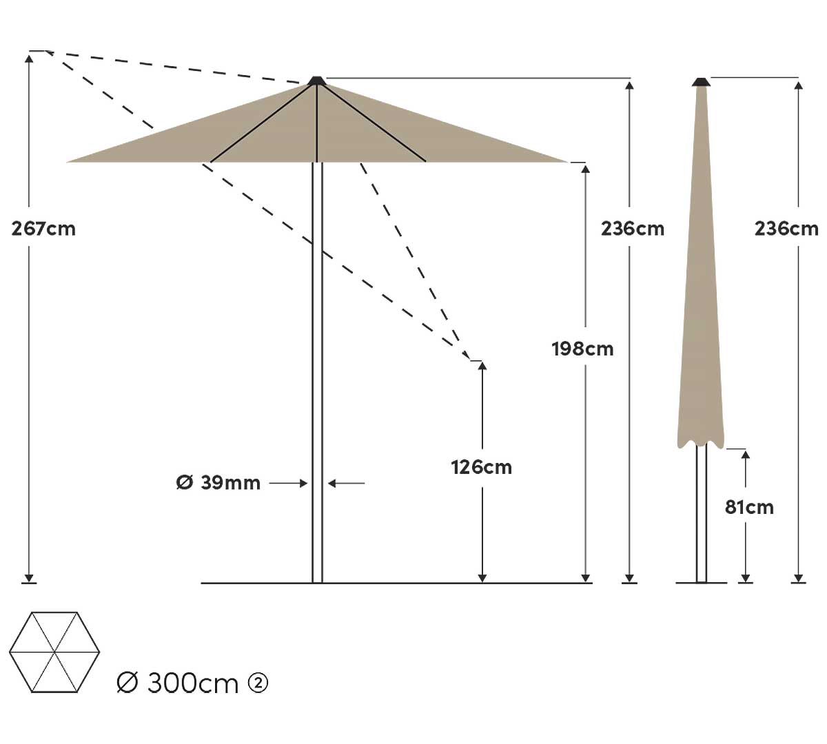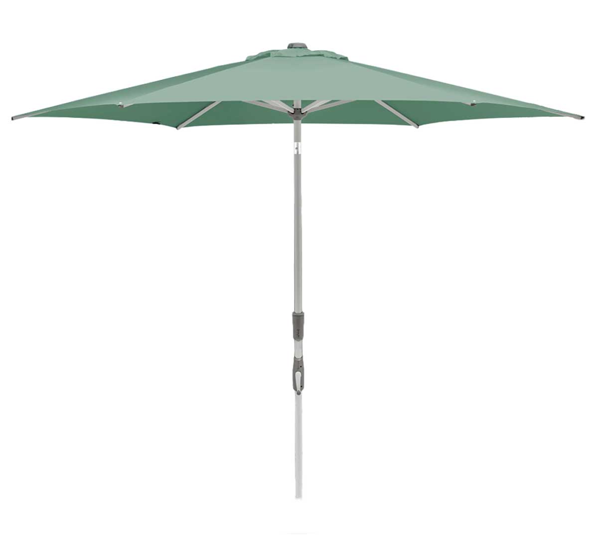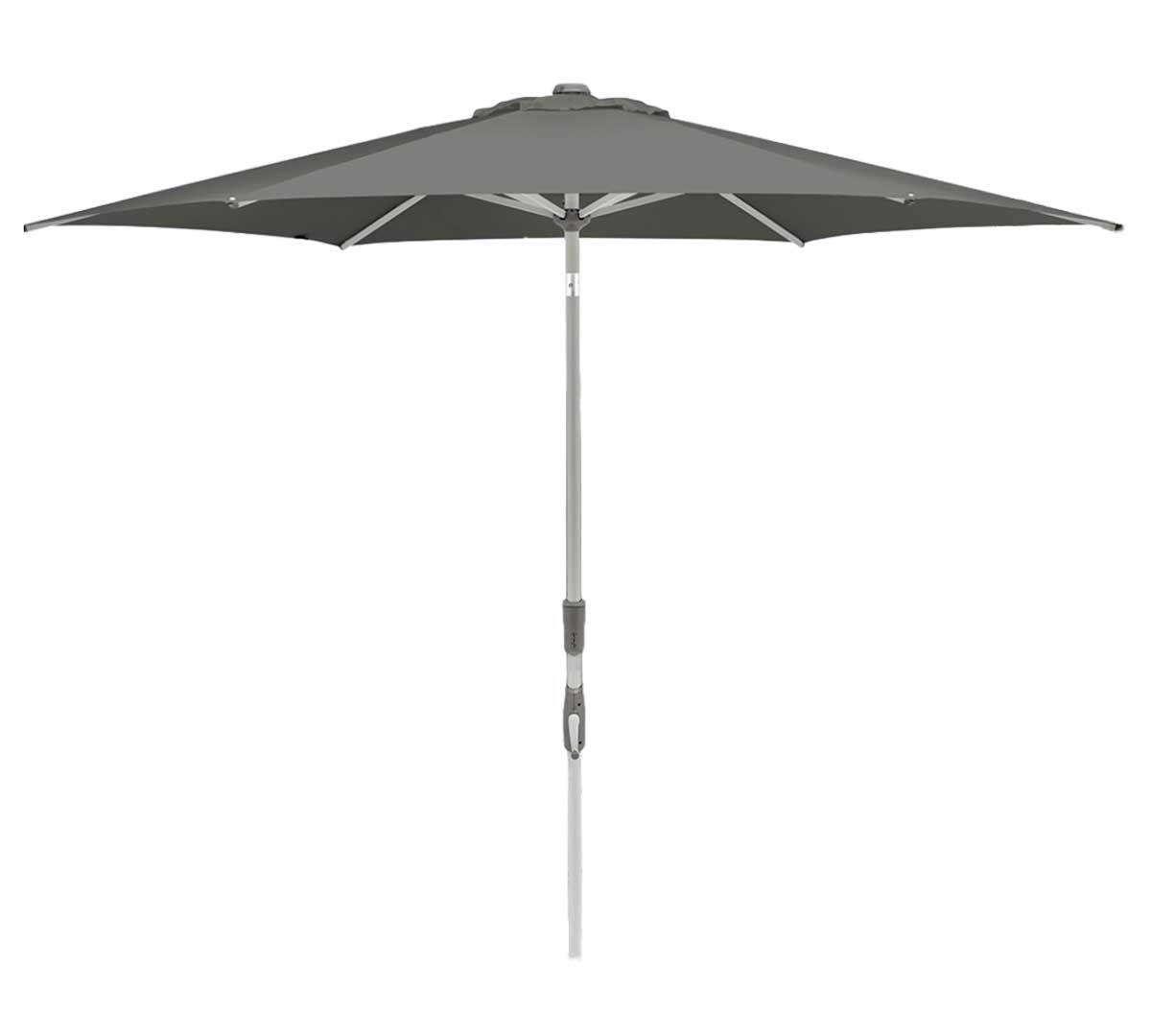 Sombrilla redonda que se abre y cierra mediante manivela. Ofrece protección solar con tejido 100 % poliéster de 180 g/m² repelente al agua y 98 % de protección UV. Permite una inclinación hacia un lado. El mástil es de aluminio y la estructura de acero. La base no está incluida. Consulta las bases disponibles.