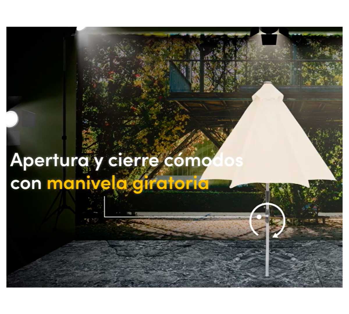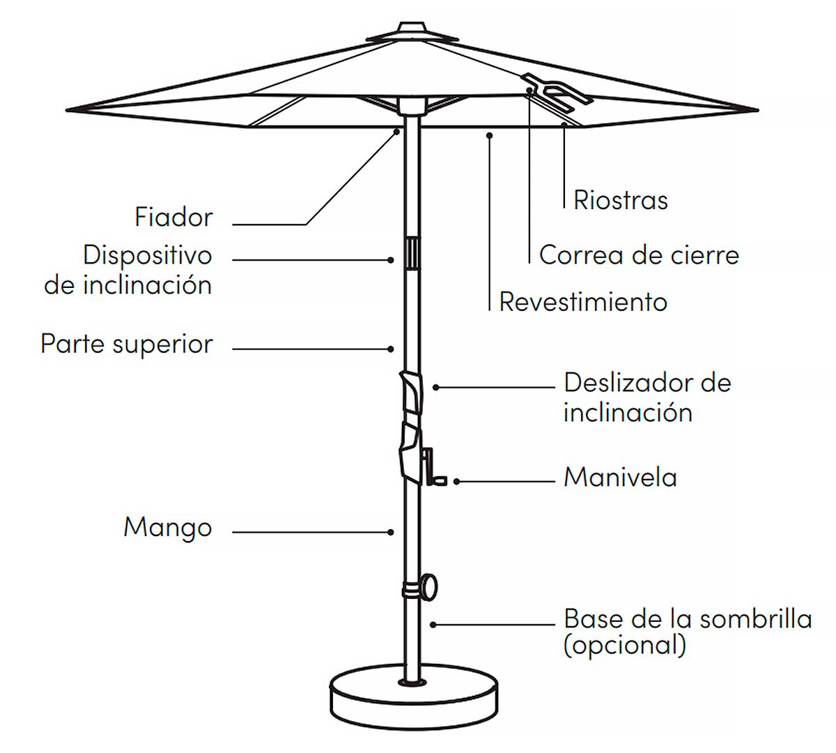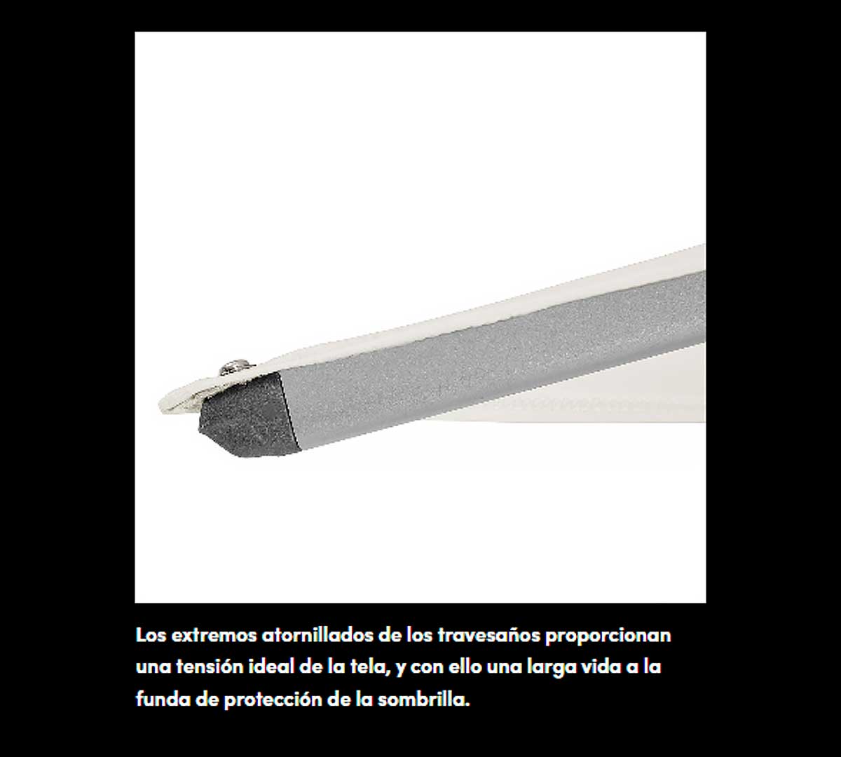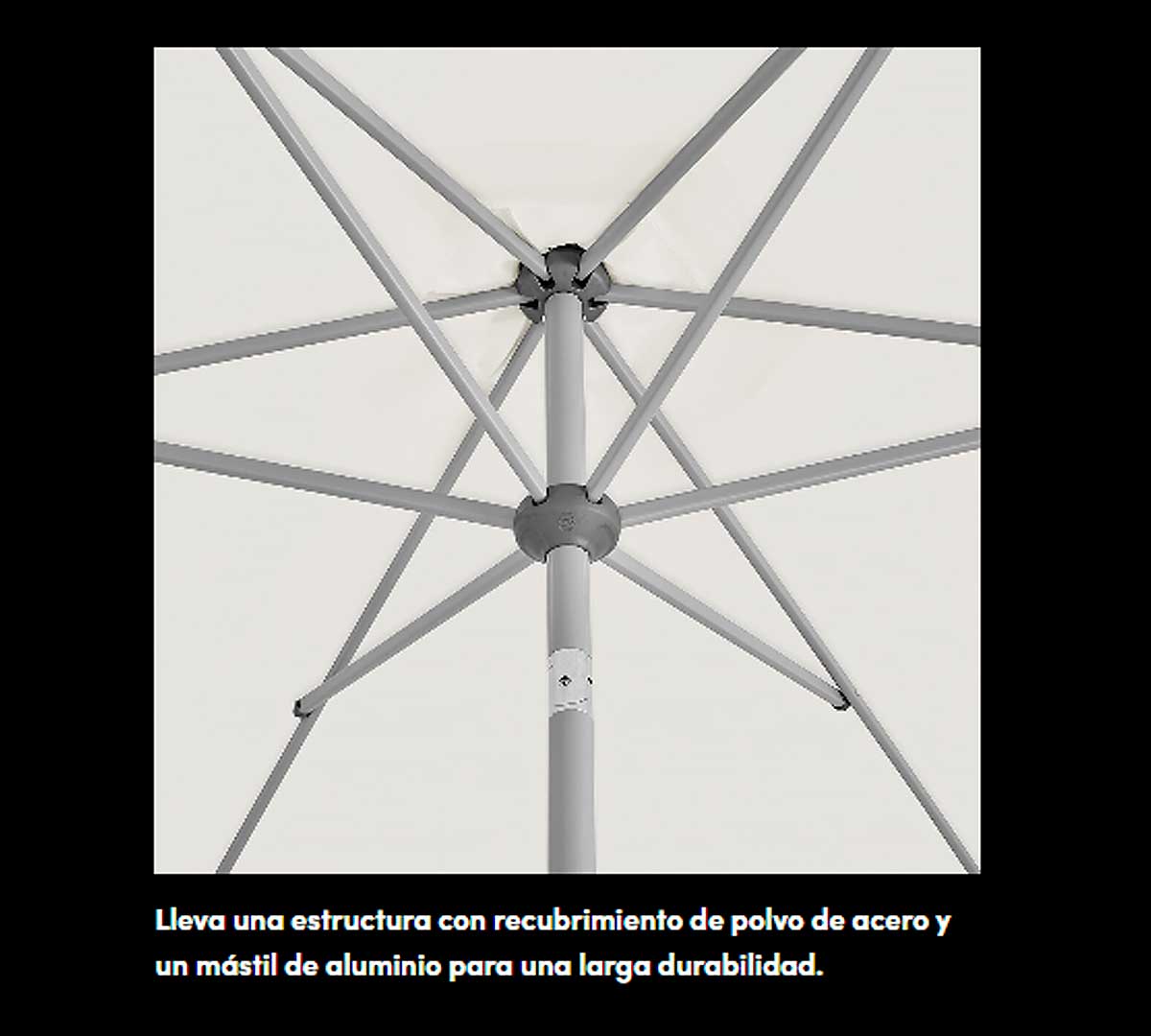 Como cualquier parasol, no está diseñado para soportar viento fuerte. Se recomienda cerrarlo siempre cuando no esté en uso o en caso de rachas de viento, incluso moderadas, para evitar daños en la estructura o el telaje.