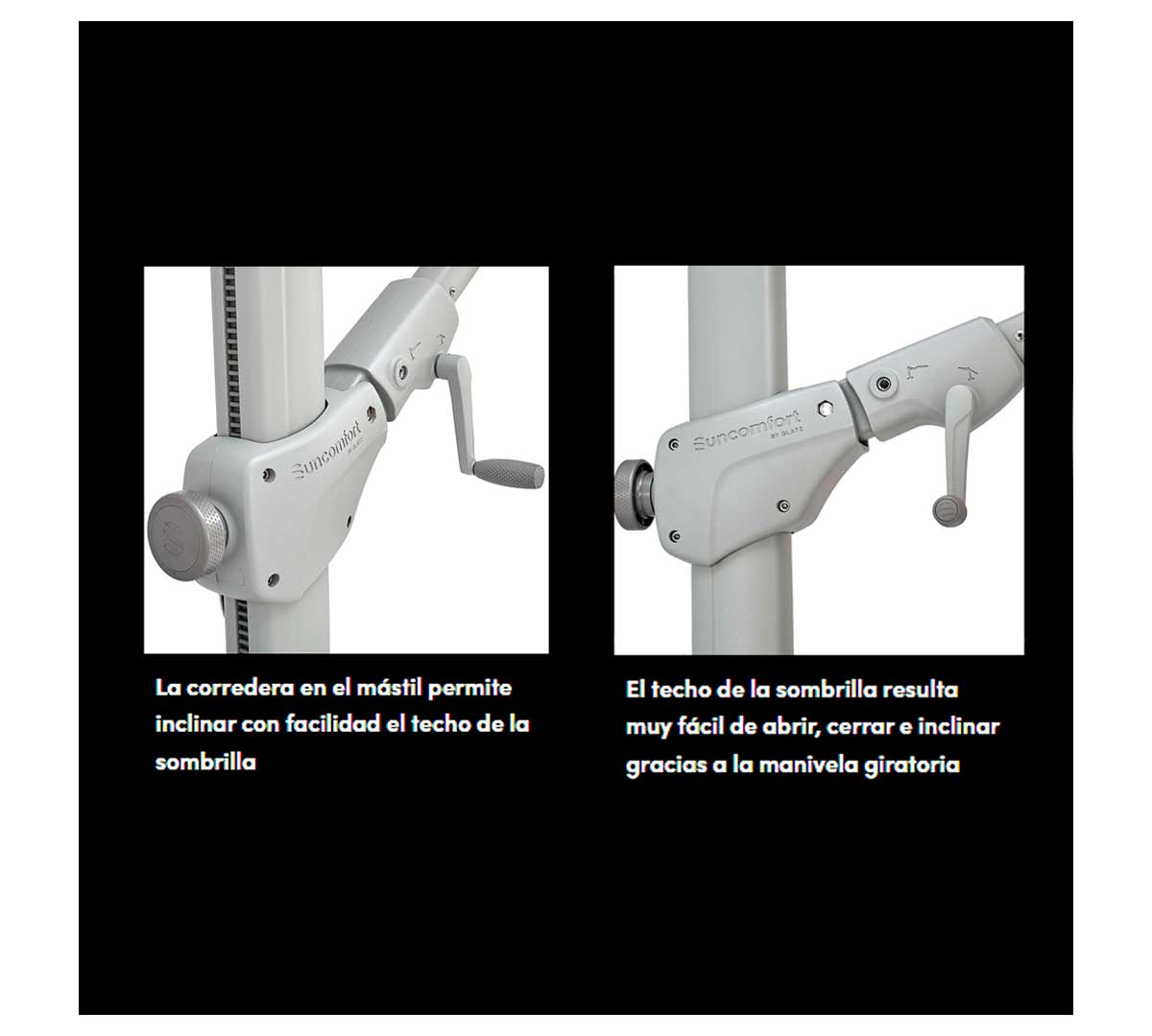 El Parasol Suncomfort Varioflex 3,3 x 2,7 de Glatz tiene el techo inclinable y orientable y la base en cruz giratoria de 360°, permiten adaptar la sombrilla la posición del sol. Su mástil y estructura 100 % de aluminio hacen que sea especialmente robusta y resistente a la corrosión. La manivela giratoria permite abrir, cerrar e inclinar de forma cómoda la sombrilla.