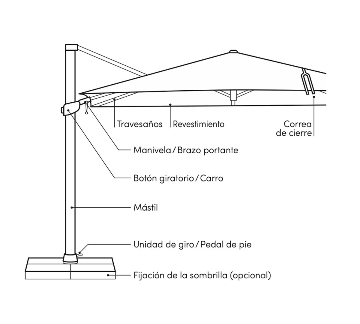 Parasol rectangular de mástil lateral con estructura de aluminio robusta. Gracias al techo de la sombrilla, inclinable y orientable, y a la base en cruz giratoria de 360°, se adapta a la posición del sol. La manivela giratoria permite abrir, cerrar e inclinar de forma cómoda la sombrilla. Incluye funda de protección. Las losas no están incluidas. Consulta las bases disponibles.