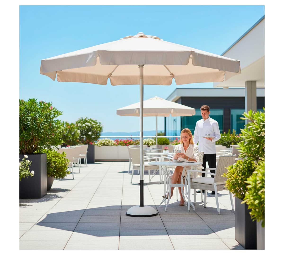 El Parasol 7510 de Muebles Romero tiene el mástil de aluminio lacado en color gris de dos piezas. El telaje es 100% poliéster en color crudo.