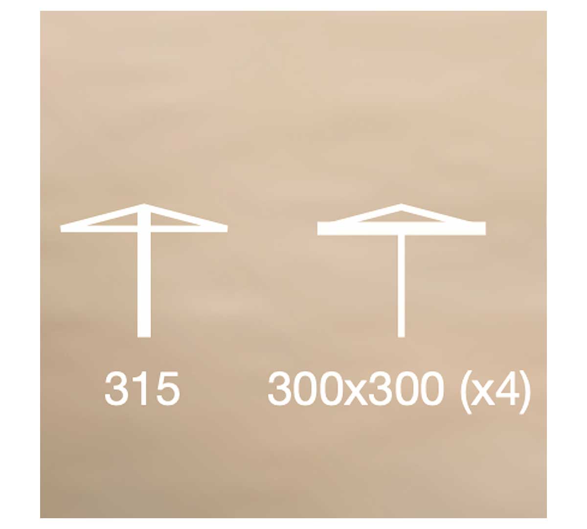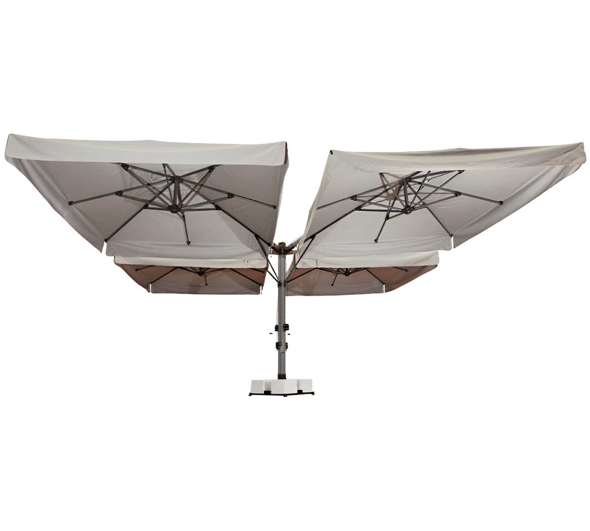 Conjunto formado por 4 sombrillas en una sola estructura para generar una amplia zona de sombra continua. Con estructura de aluminio lacado en color gris. La lona es de poliéster repelente al agua y con chimenea para una protección eficiente y estética cuidada. La base y las losas están incluidas.