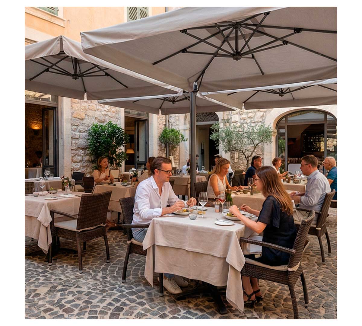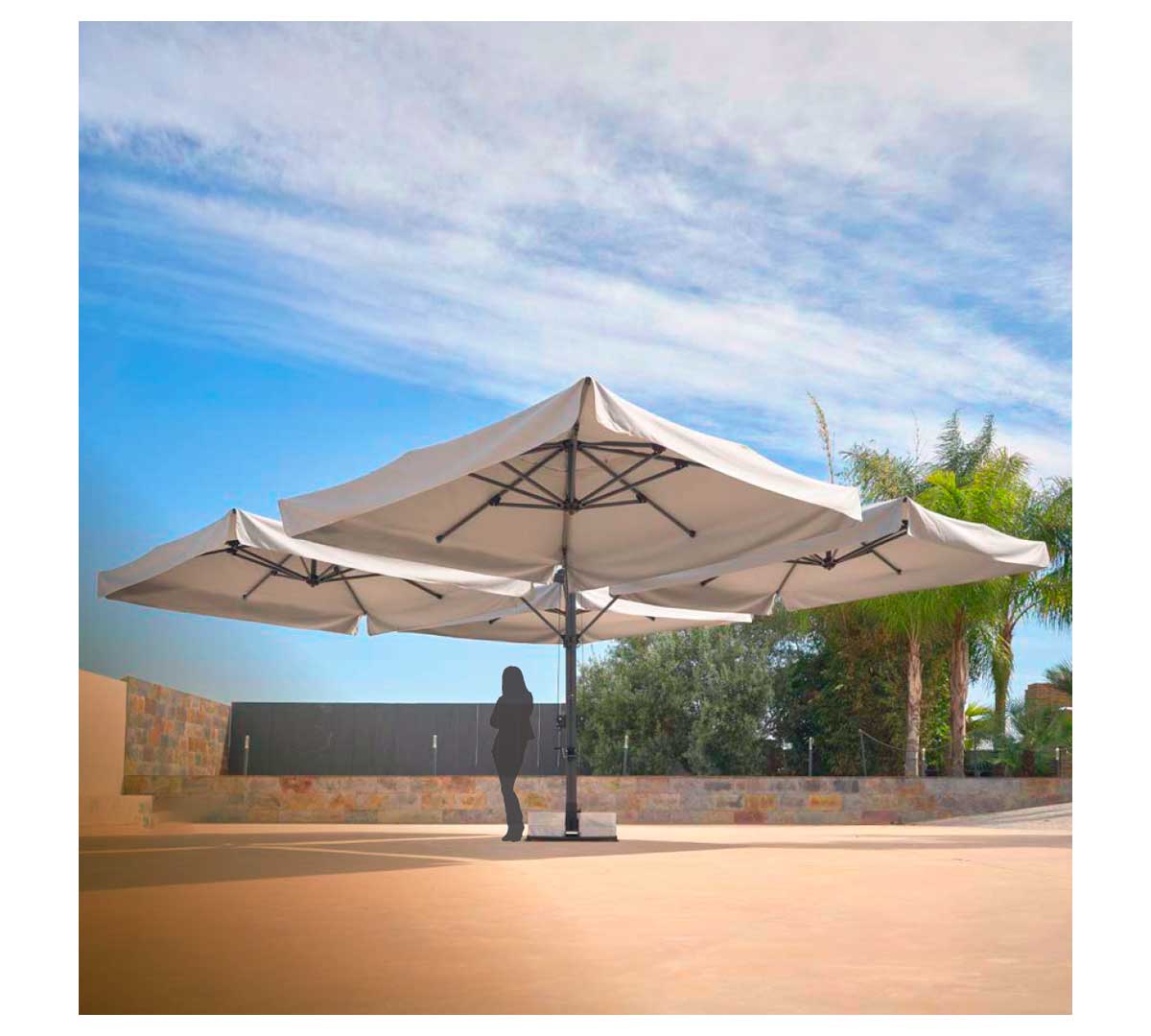 Este parasol de gran superficie está especialmente indicado para terrazas y jardines de restaurantes, bares, hoteles y cafeterías que necesitan cubrir zonas amplias con una solución continua de sombra.