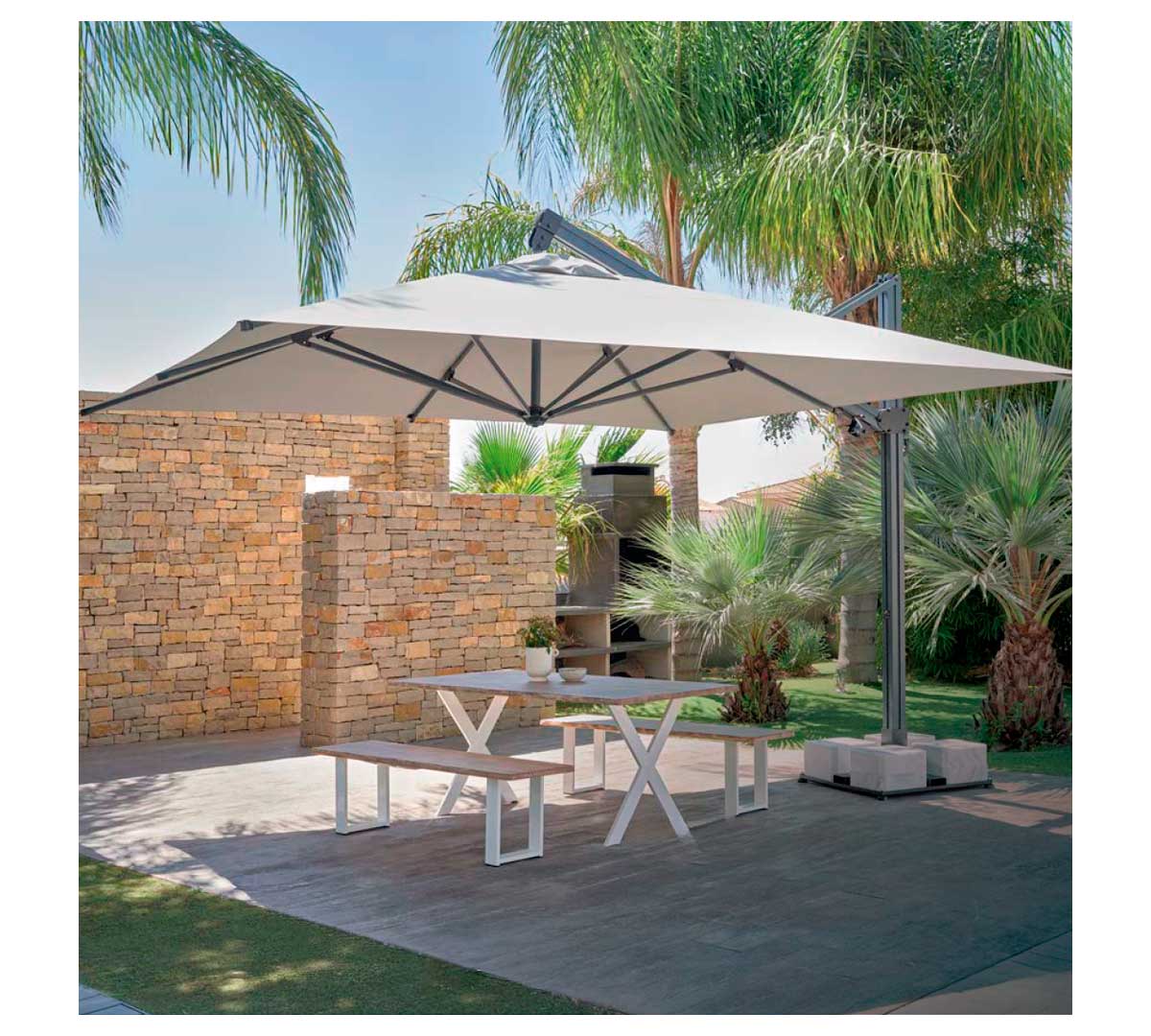 Este parasol cuadrado está concebido para aportar una zona de sombra amplia y confortable en espacios exteriores, funcionando como una pérgola ligera y versátil que se integra con facilidad en ambientes modernos, mediterráneos o urbanos.